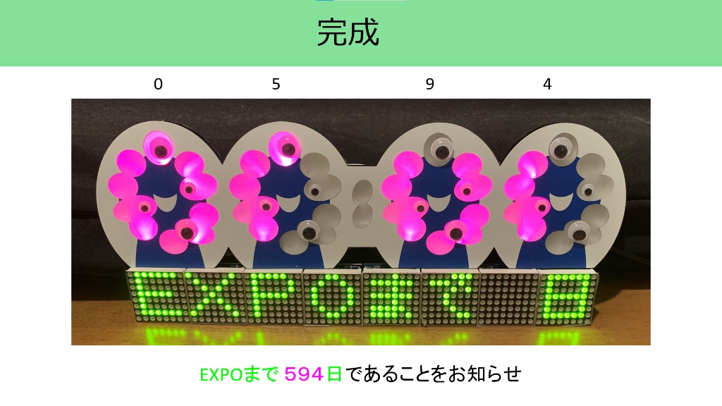 LEDモジュールを試作し、日時とEXPOまでの残り日数をカウントダウン表示するガジェットにしました。