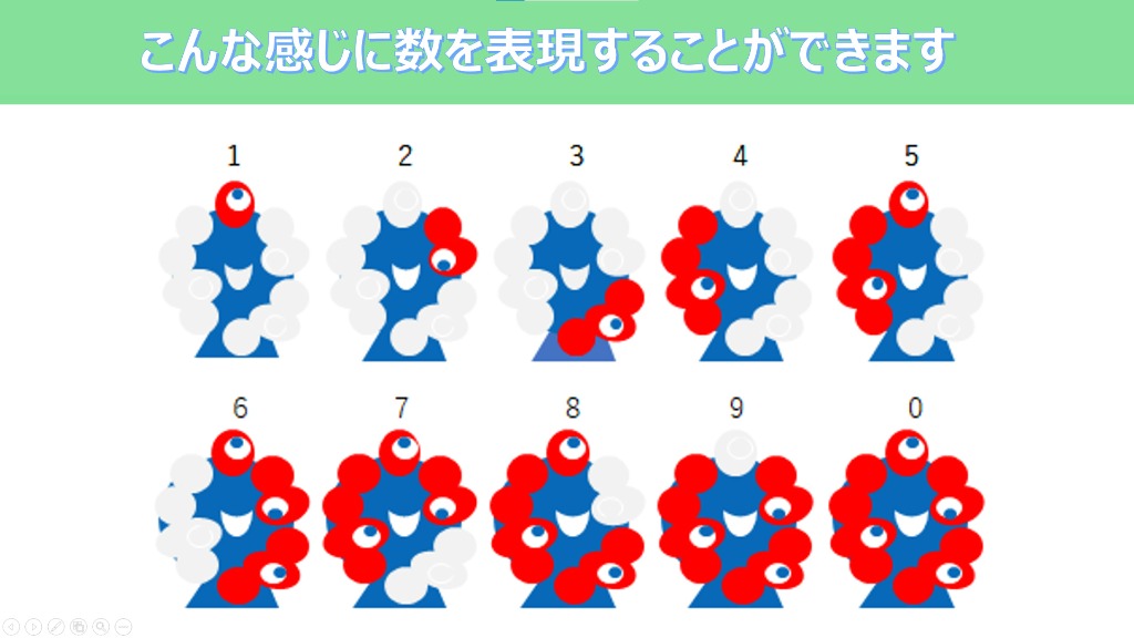 4つのセグメントで数を表現する新しい方法を考えました。●の数で数字を表し「0」は形で表します。
