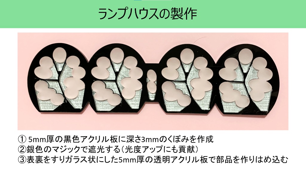 今回は展示で目立たせるため下部にマトリクスLEDを使いましたが、省電力化したければ印刷でも良く、数値表現部は、7セグメントが桁毎にLEDを7個必要なのに対し、5個で数値を表現できるので大型化した際などにも省エネ運用が可能で、電池駆動やCO削減社会に貢献します。