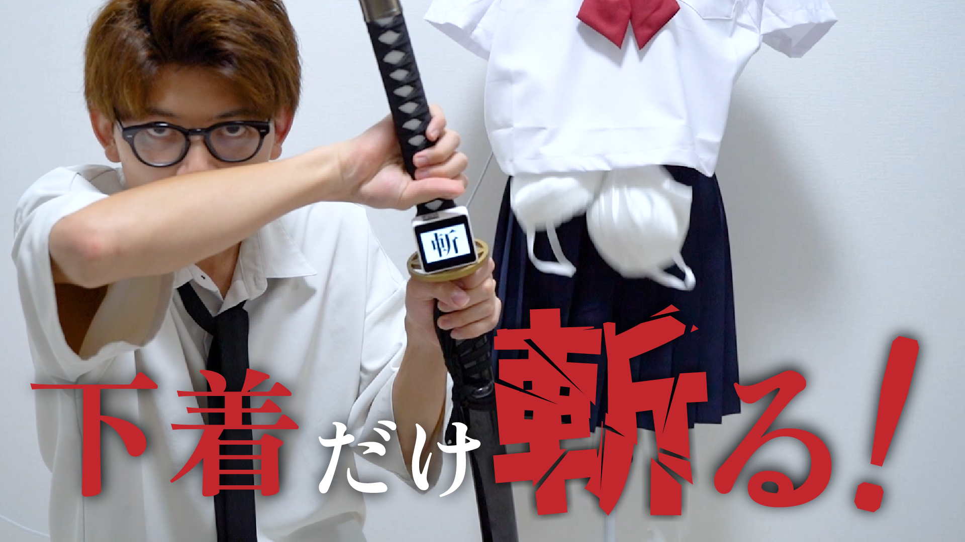 ギャグアニメで見る「刀で服だけ斬る」を再現しました。抜刀すると下着が斬れます。主な目的は人前で斬る様子を披露し笑わせることです。制作者はお笑いライブに出演する際に、小道具として使用しています。