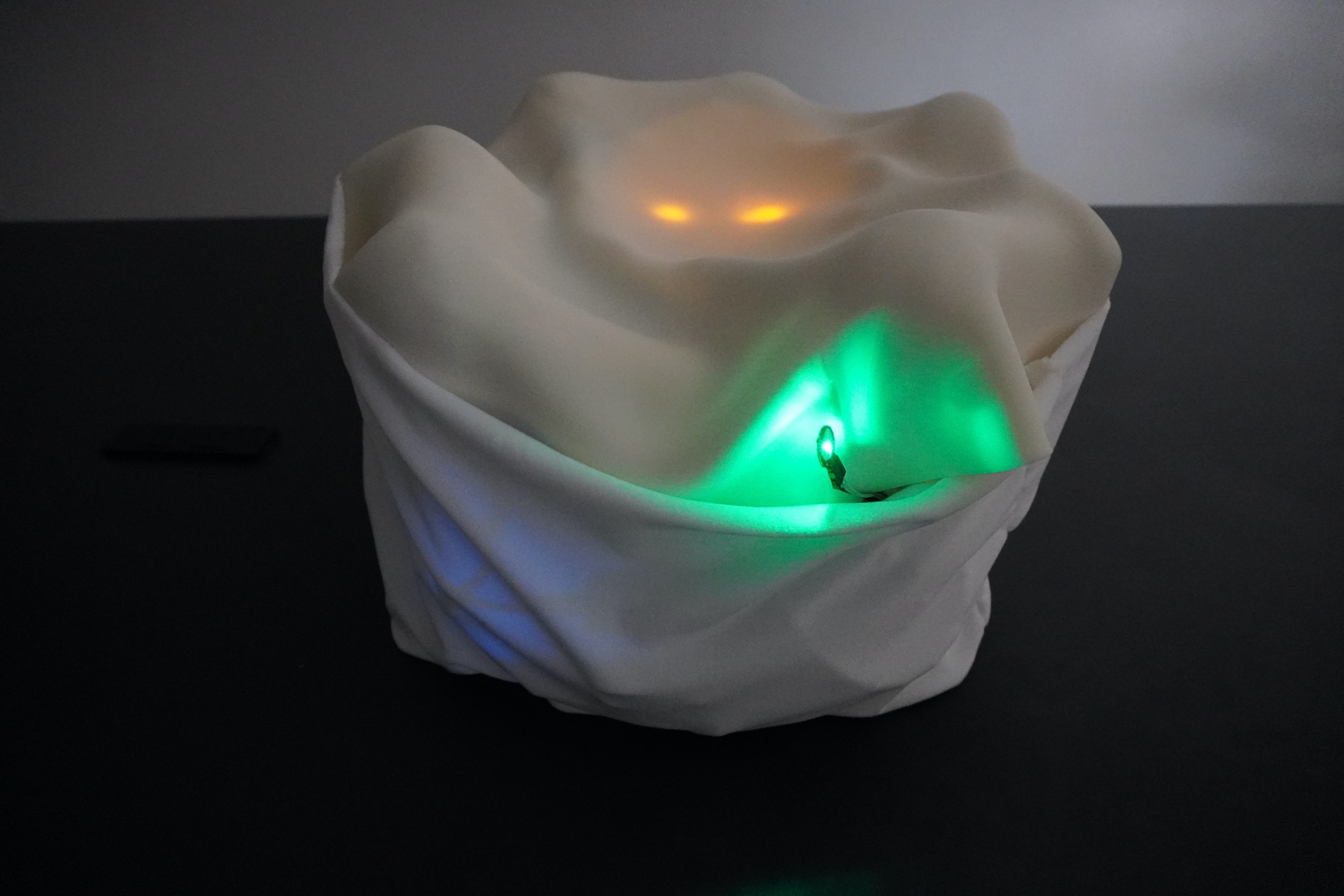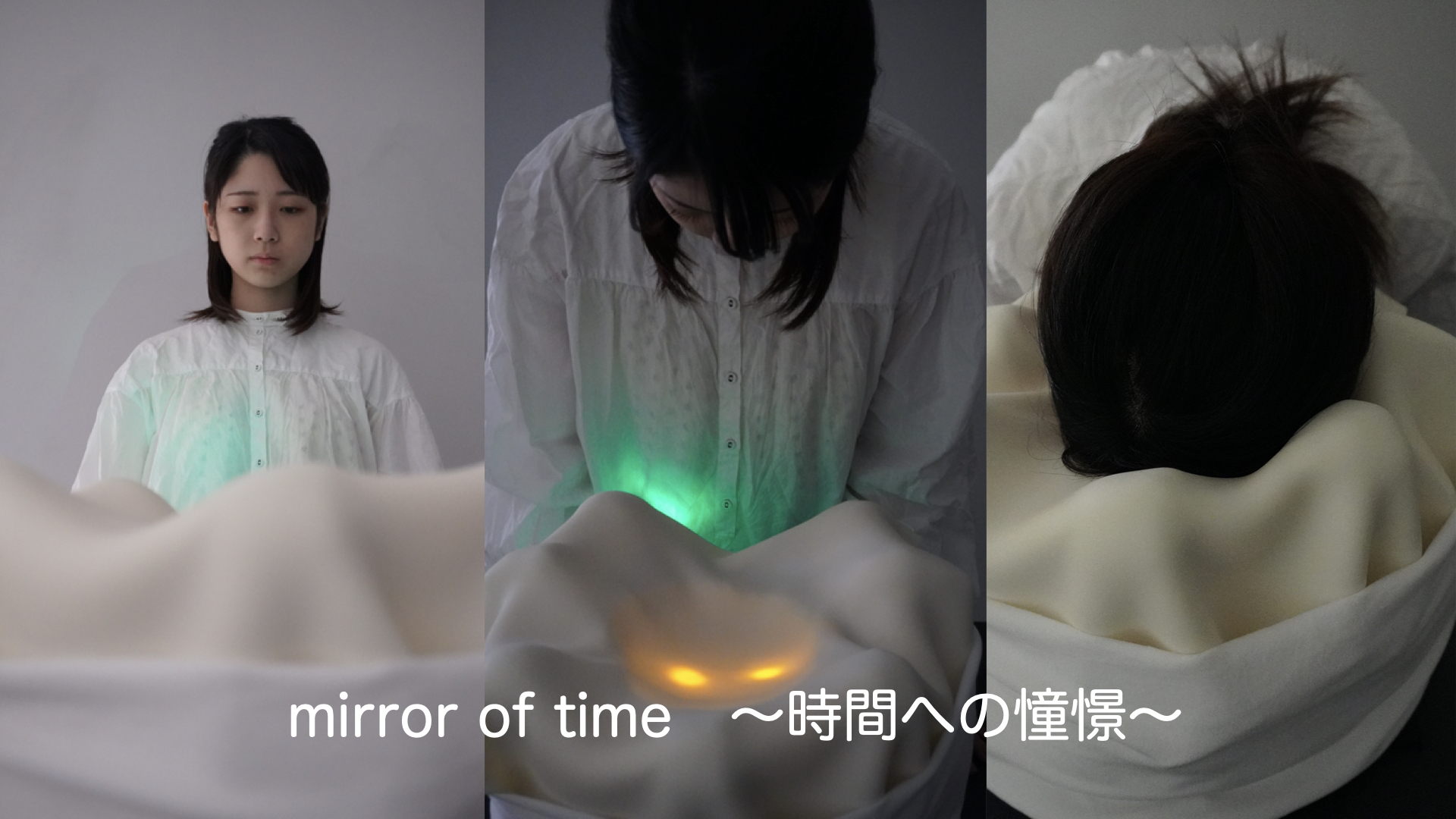 この作品は水鏡を模した「mirror of time」で自分を移しとり、自分から発せられるもので生成された音と(聴覚)、人肌に頭部を包み込まれる感触(触覚)、包まれた時に感じる暖かさ(温度)などを表現しています。