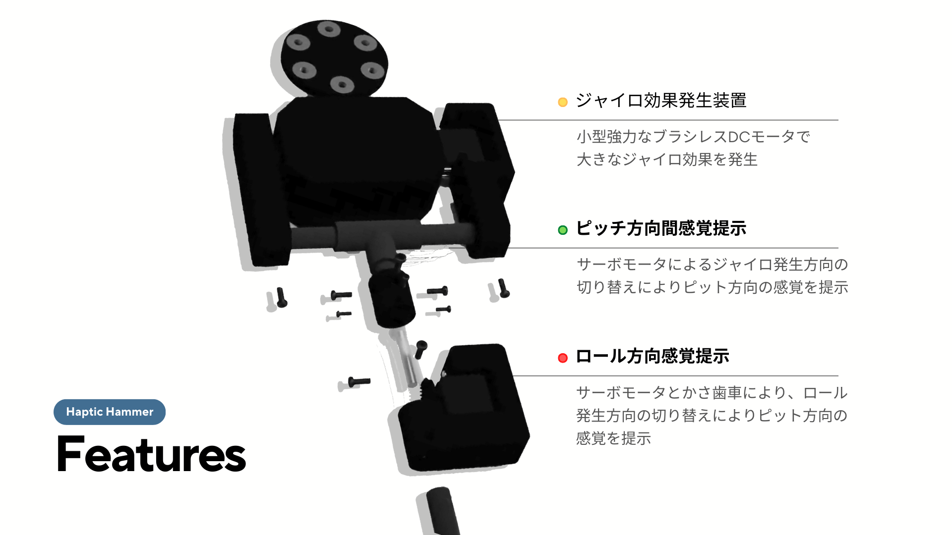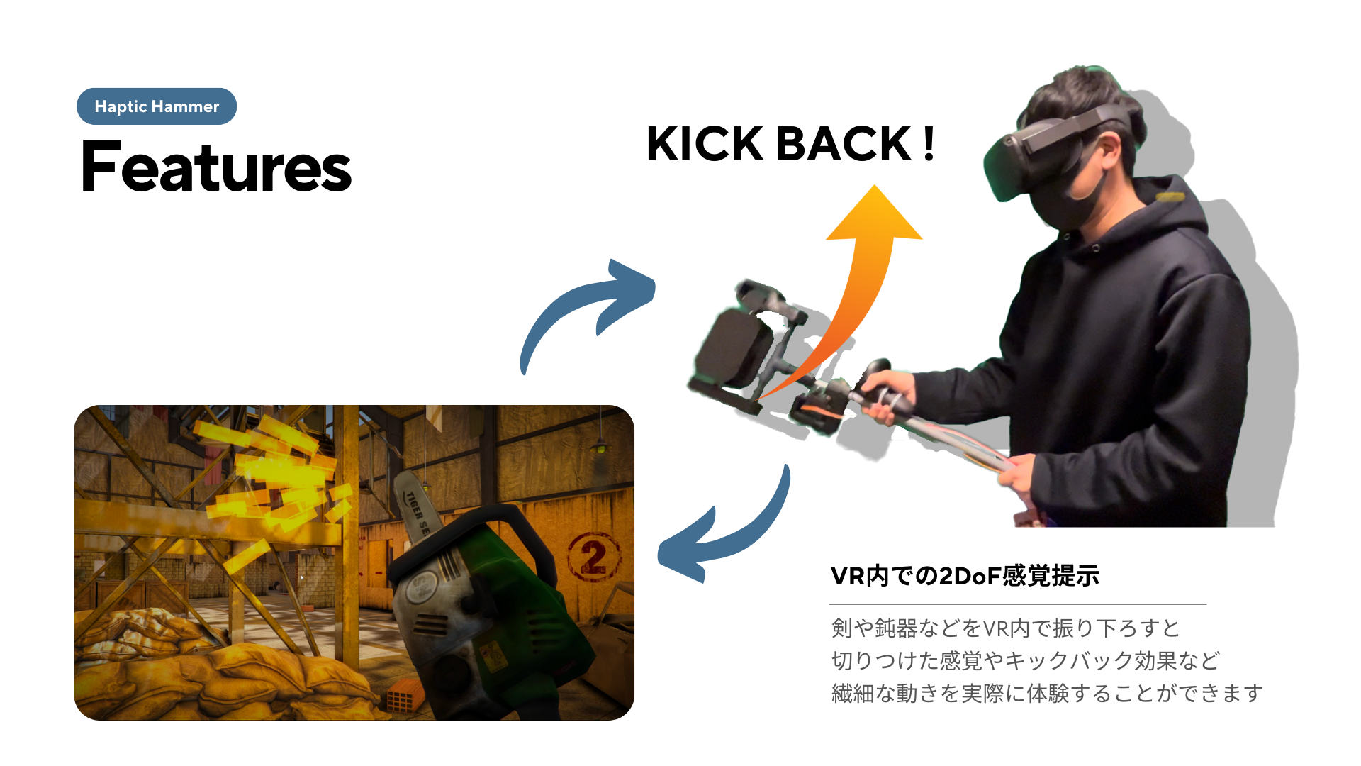 強力なジャイロ効果発生装置と、従来はなかった2自由度(2DoF)の感覚提示ができることが特に大きな特徴で、大剣で斬りつけた感覚やチェンソーでのキックバック効果などのダイナミックかつ繊細な動きを体験することができます。