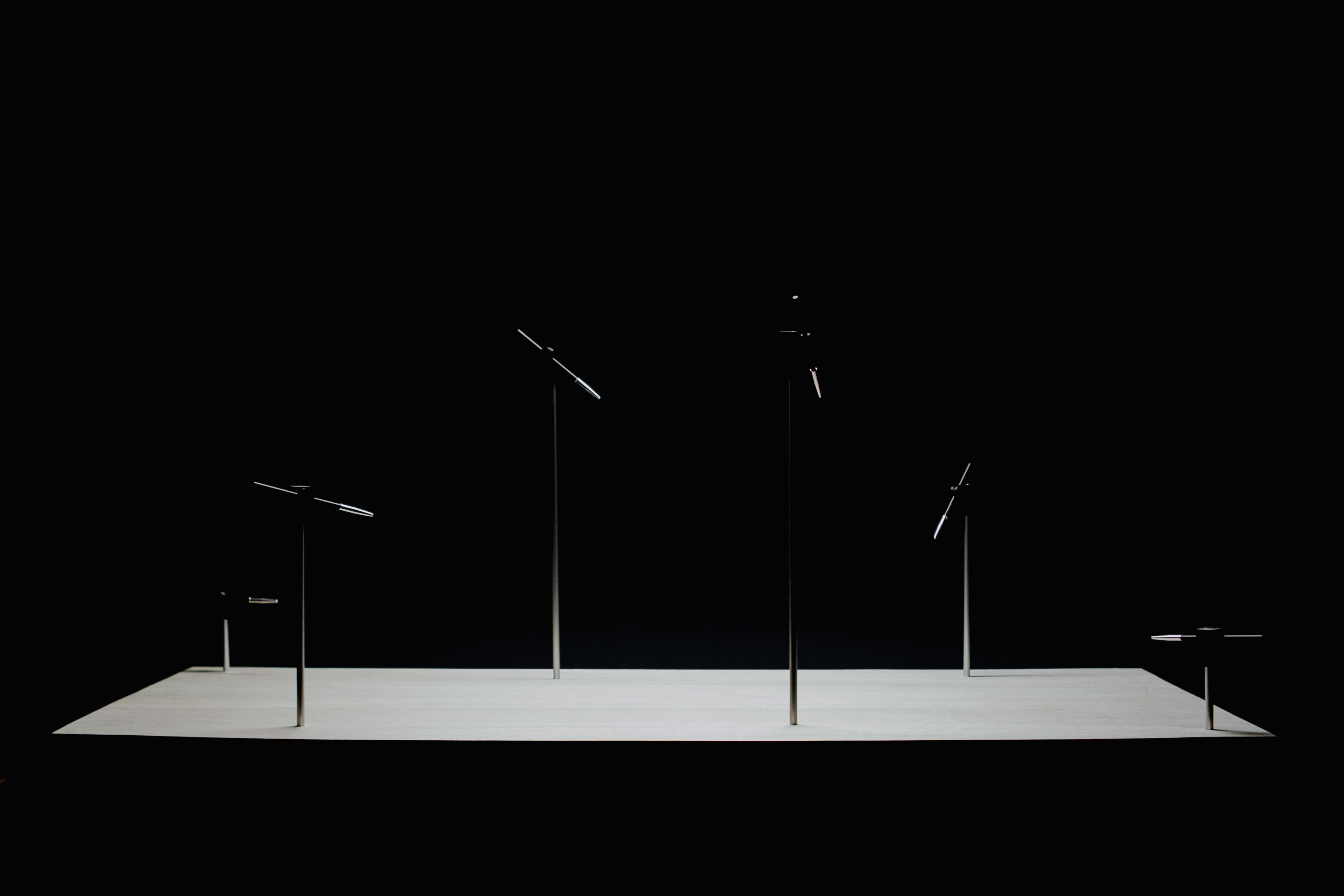 これは、見えない物体を追いかけるように指差しを行うロボット群からなる作品です。物理的には何も存在していない空間に対して、ロボットたちが「あたかもそこに何かがあるように」指差しを続けています。私たちは肉眼ではその対象を見ることはできませんが、「指差しを続けるロボットたちの動き」を通してそこにいるはずの何かの動きや位置に加え、重さや軽さ、そこにいるはずのなにかの意思など、様々なことを感じ取ることができます。