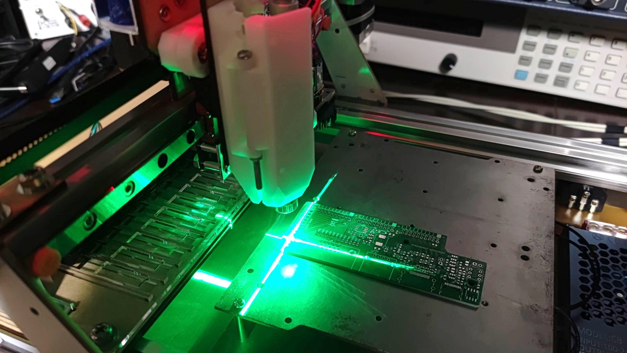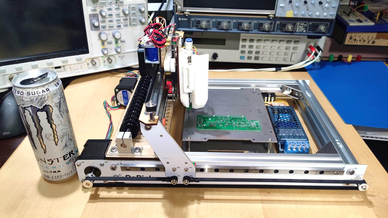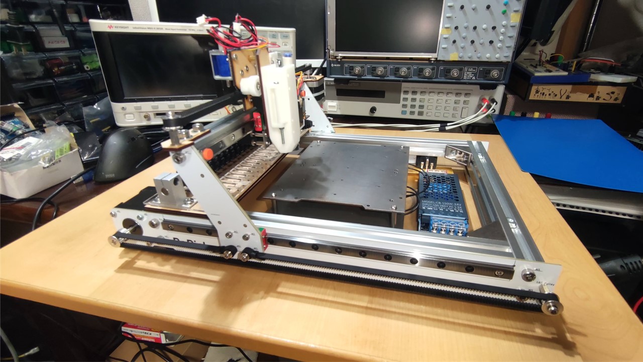 この装置は「ハンダペースト自動塗布」「チップマウンター」「リフロー炉」の3機能を備えており、基板と部品があればメタルマスク無しでプリント基板を完成させます。小型化を重ねてA3サイズになりました。
