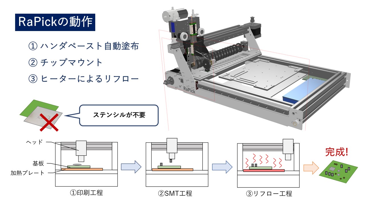 「RaPick」はハンダ付けを含む部品実装をすべて自動で行ってくれる装置です。