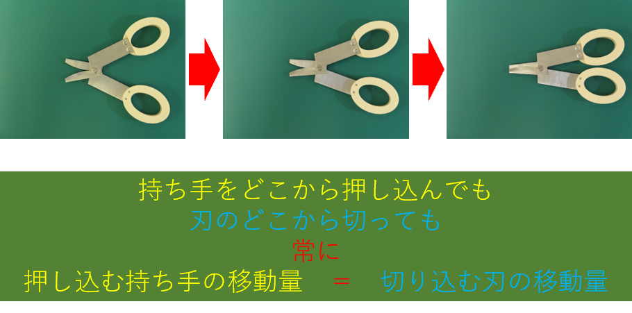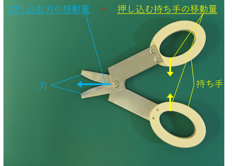 一般的な鋏では,2つの一体となった持ち手と刃が,ジョイントにより接続される。2つの持ち手を,それぞれの持ち手の方向に押し込むことで移動させると,ジョイントを支点とした,てこの原理により2つの刃が連動する。2つの刃の交点で刃がものに切り込み,交点が移動することでものを切断する。しかし,切断するものの長さにおいて,持ち手を押し込む移動量と刃が切り込む移動量が異なる。