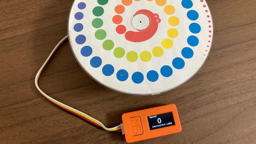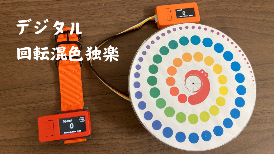 M5Stackを使用してモーターを制御し、回転混色を楽しむことができます。腕に付けたコントローラを振ると、回転混色の駒が回り始め、色が変化していく様子を楽しめます。