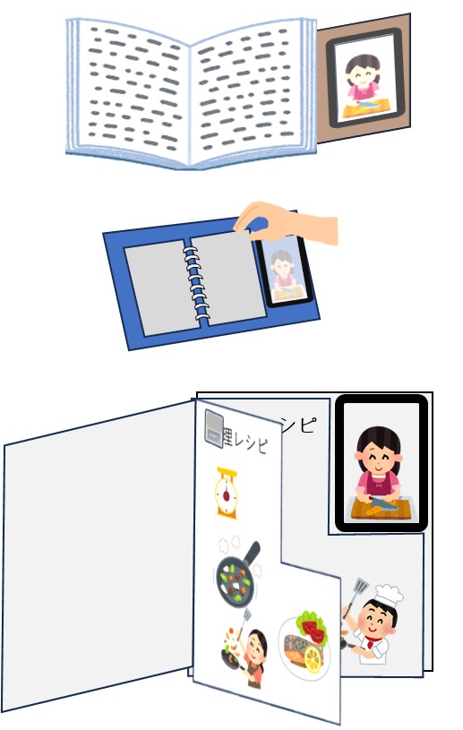 本の読み上げや、料理本等であれば、文字や静止画で表現できない動きの表現などをページを開くのと同期して提供することができます。必要なのは、スマートフォンやタブレット、またはNFCのリーダーを持ったオリジナルデバイスと、本技術を入れた印刷物とシート、you tubeやコンテンツを入れたWebストレージもしくは、オリジナルNFCアプリになります。シートは、バッテリー等は不要で無電源で動きます。