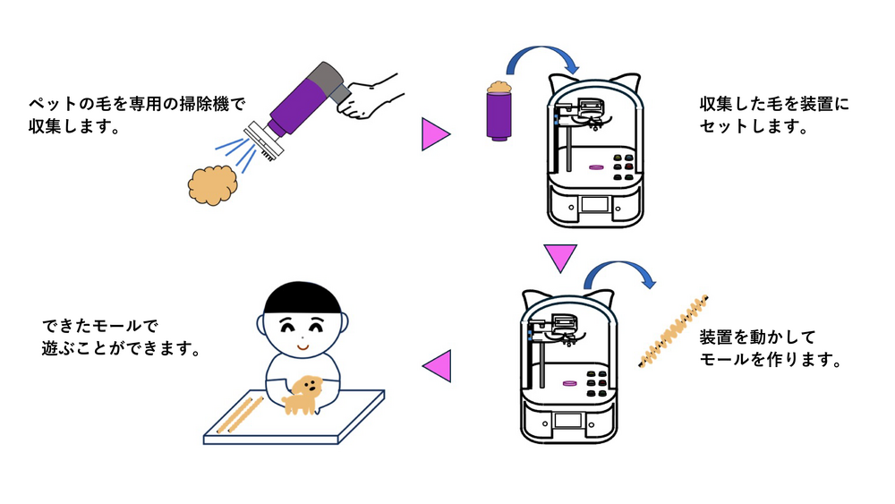 本研究は、ペットの毛をアップサイクルすることで、飼い主に感情的な価値と特別な思い出を形に残す手段を提供します。この取り組みにより、廃棄物削減に貢献し、持続可能な社会への意識向上にも寄与します。さらに、開発した装置を使用することでクラフト体験を楽しみながら、ペットとのつながりをより感じることができるため、環境への貢献を促進する独自の技術として役立ちます。