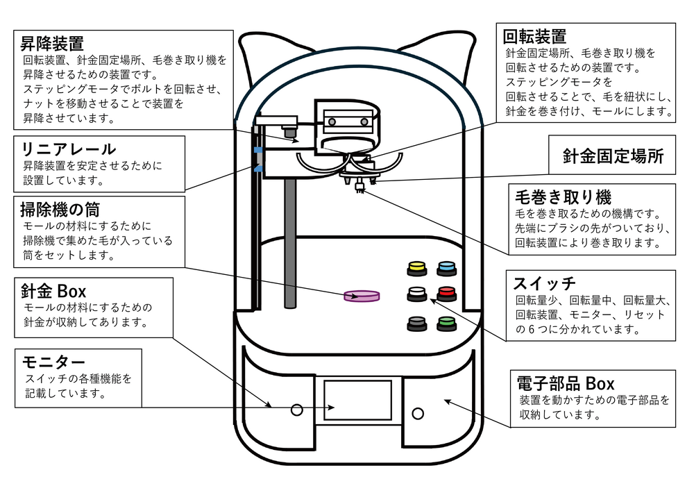 本研究では、明治期に日本で発明されたガラ紡機の技術と、我々が独自に考案したモール制作手法を組み合わせ、ペットの毛を粉砕せずにモール化する装置を開発しました。まず、ガラ紡機を用いてペットの毛を紐状に加工します。次に、その紐状のペットの毛を2本の針金で挟み、捻ることでモールを制作します。この手法により、従来の「繊維を均等に並べて2本の針金で捻る」方法では難しかった、ペットの毛を使ったモール制作が可能になりました。また、捻る量を調整することで、ペットの種類に応じたモールを制作することができます。さらに、この装置で制作されたモールは、市販品に比べ、動物特有の質感と色合いが際立っており、飼い主にとってより親しみやすい特徴を持っています。