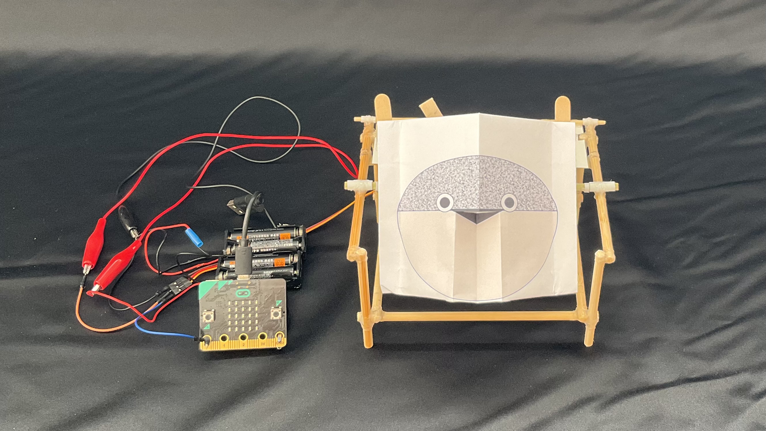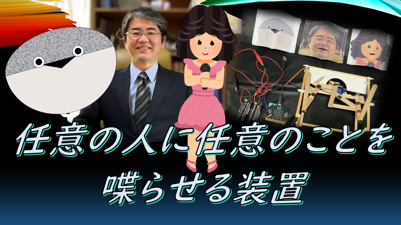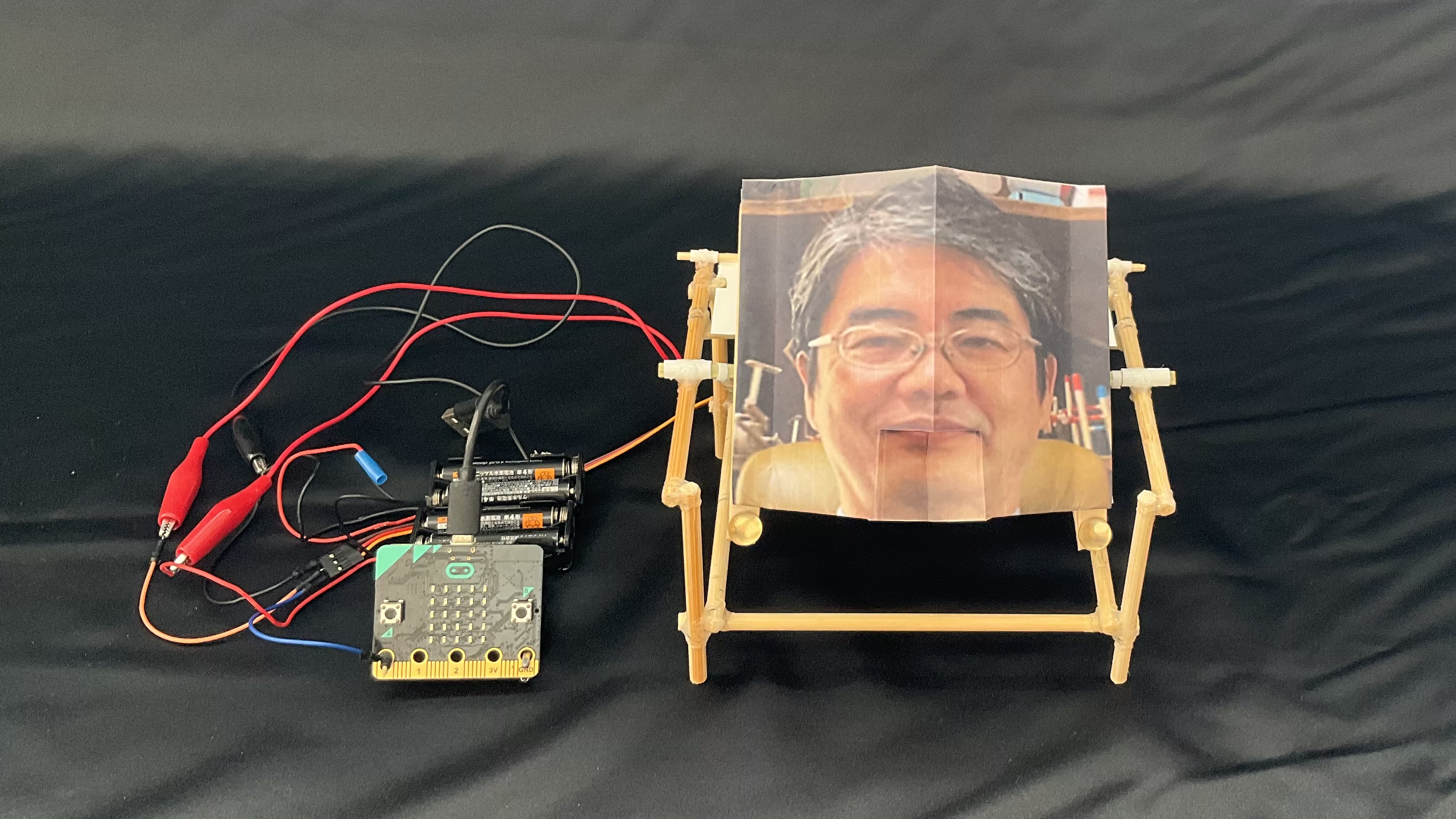 皆さんは子供の頃に切り込みを入れた紙を口に見立ててパクパク動かして遊んだことはありませんか.また,大人になってからは紙幣の肖像画を折り曲げて笑わせたり怒らせたりしたのではないでしょうか.紙を折ったり傾けたりすることで描かれた顔の表情が変わるわけです.一方,私たちが普段喋っている50音はわずか6種類の口の形で表現できます.これらのことから着想を得て,任意の人に任意のことを喋らせる装置を開発しました.100均で購入した竹箸や木製スティックなどで表情を変えるための機構を作り,micro:bitで制御しました.この装置は,口の縦幅と横幅の2軸を制御しているのに,サーボモーターをたった1個しか使わないため,従来のデジタルサイネージとはひと味違った動くサイネージを低価格で提供できるかもしれません.