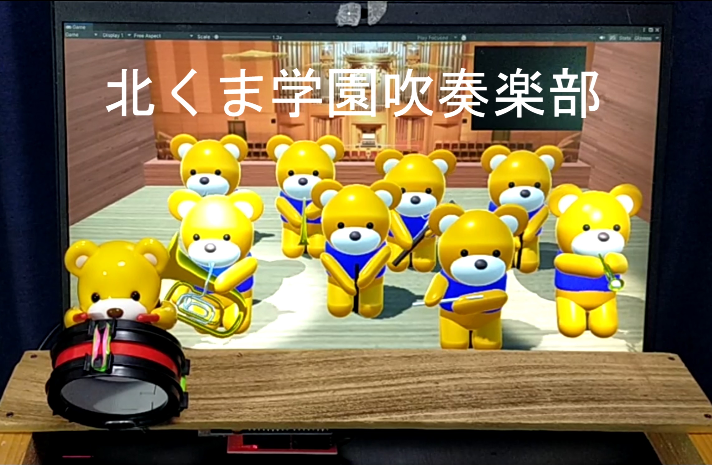 おもちゃのドラムを叩くリアルなくまさん1人と空間ディスプレイ内のバーチャルなくまさん8人が合奏してモーリス・ラヴェルの「ボレロ」を演奏します。