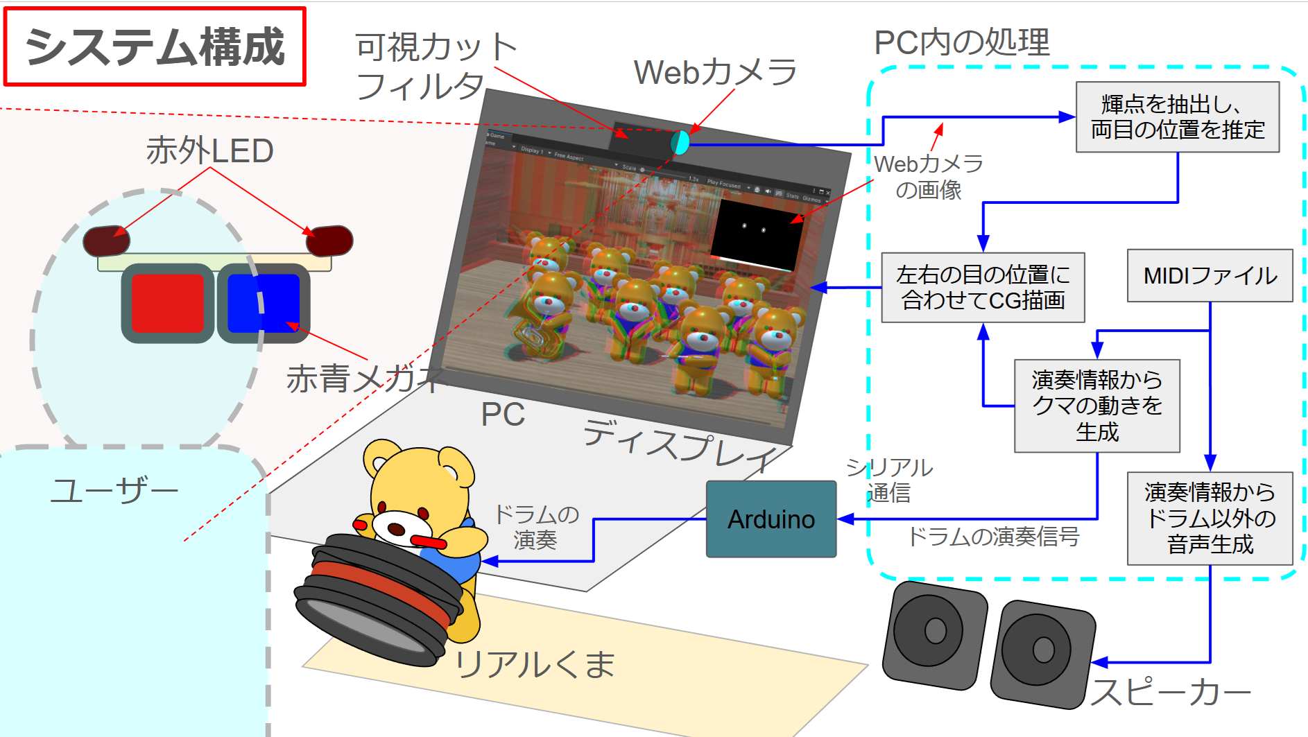 xRが普及しない最大の課題は機器が高いことととらえて、格安の空間ディスプレイ環境を構築しました。赤青メガネの両端に赤外LEDを取り付け、それを赤外カットフィルタを張り付けたPCのWebカメラで読み取ることで体験者の両目の位置を推定し、体験者からリアルとバーチャルが同じ空間にいるように見えるようにアナグリフ画像として表示します。