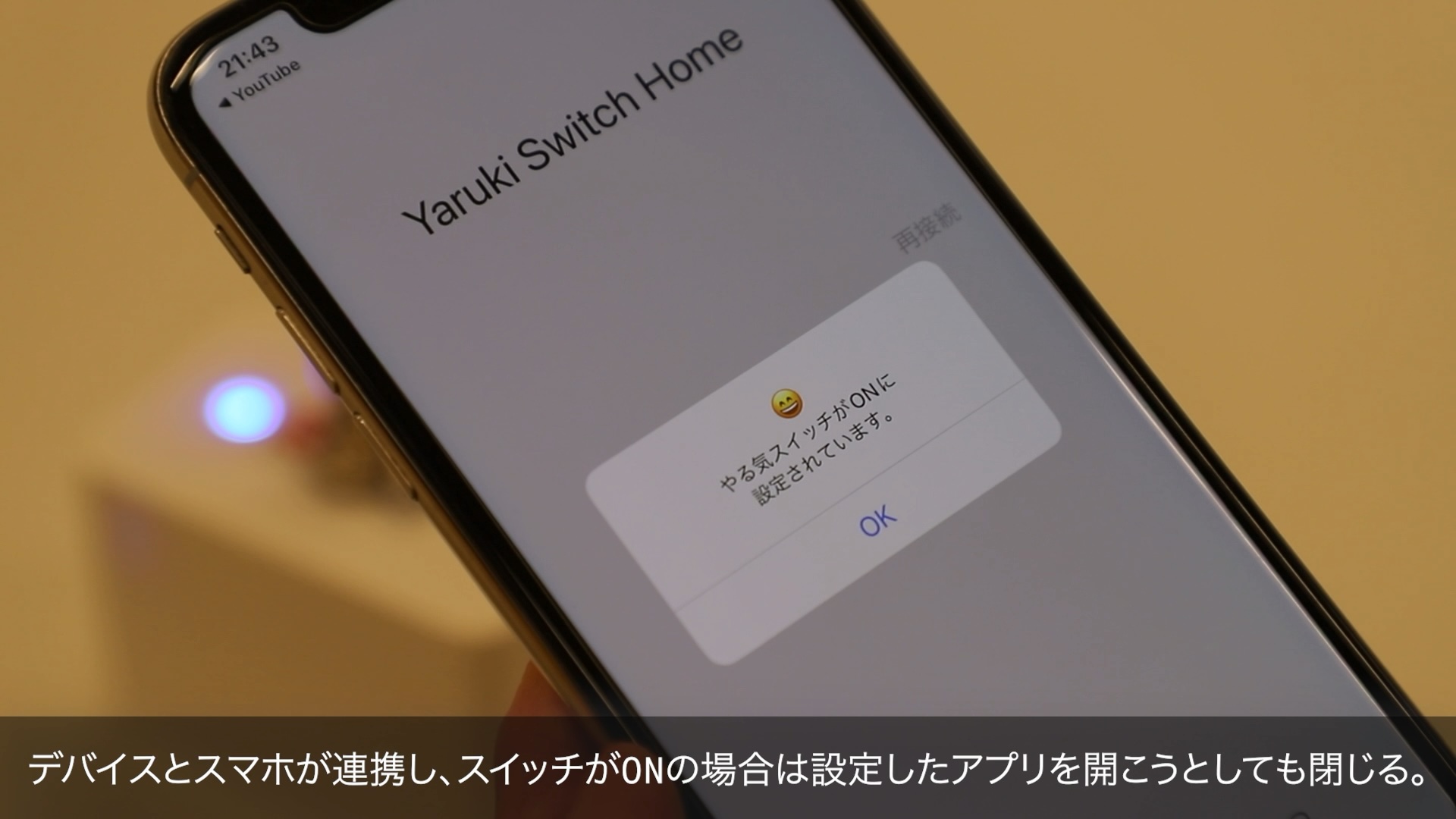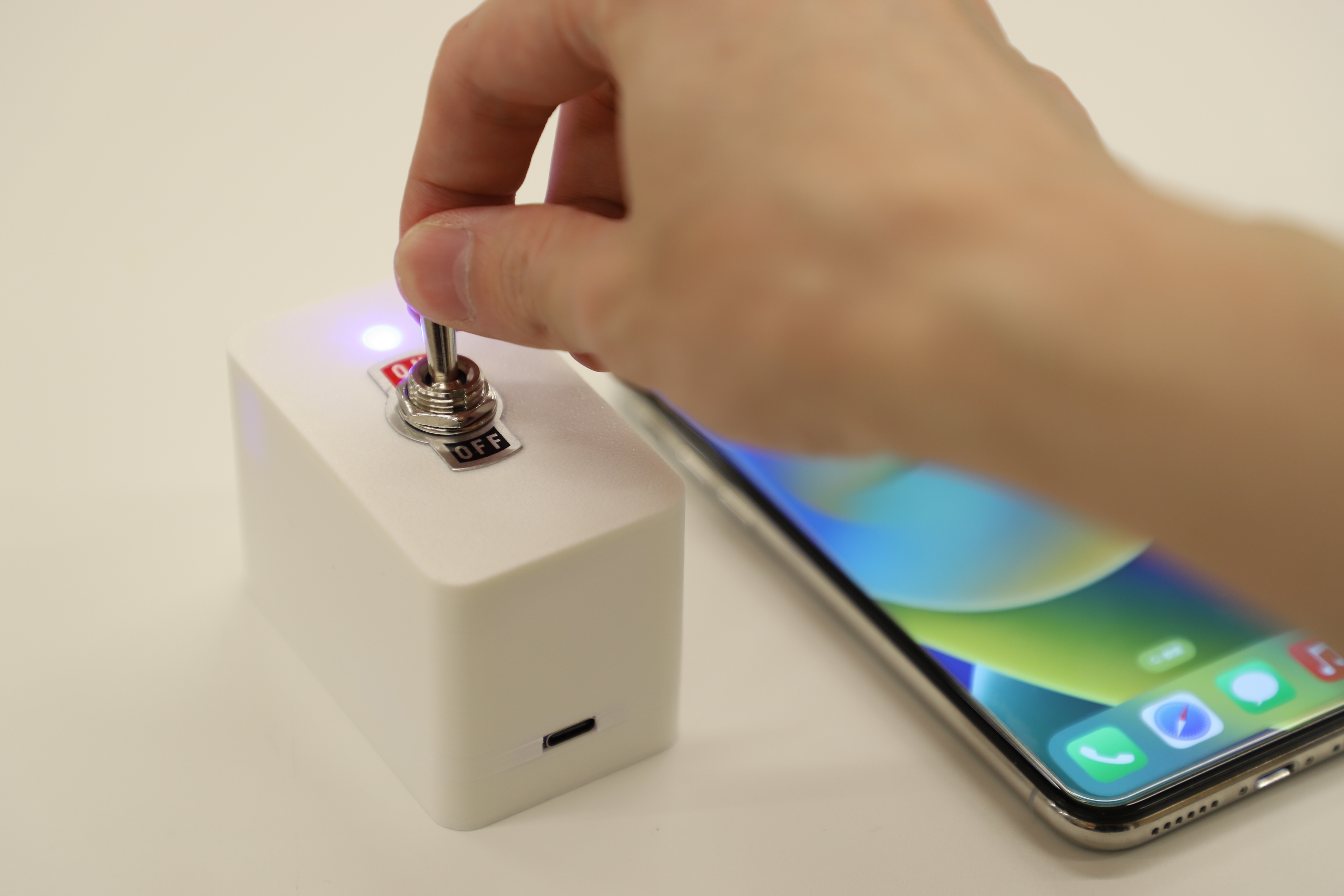 デバイスのスイッチが ON の場合、アプリを開こうとしても閉じる。OFFの場合はそのまま使うことができる。自分の意思を、スイッチ ON/OFF に表明することで、自分で自分の背中を押すことを目指す。単純に断ち切るのではないテクノロジーとの付き合い方を自分自身で探る。