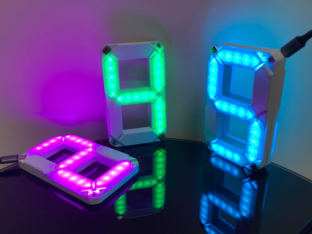 手でつかめるサイズの大きなフルカラー7セグLED。つなぎ合わせてタイマーとして使ったり、好きな数字を表現できる。