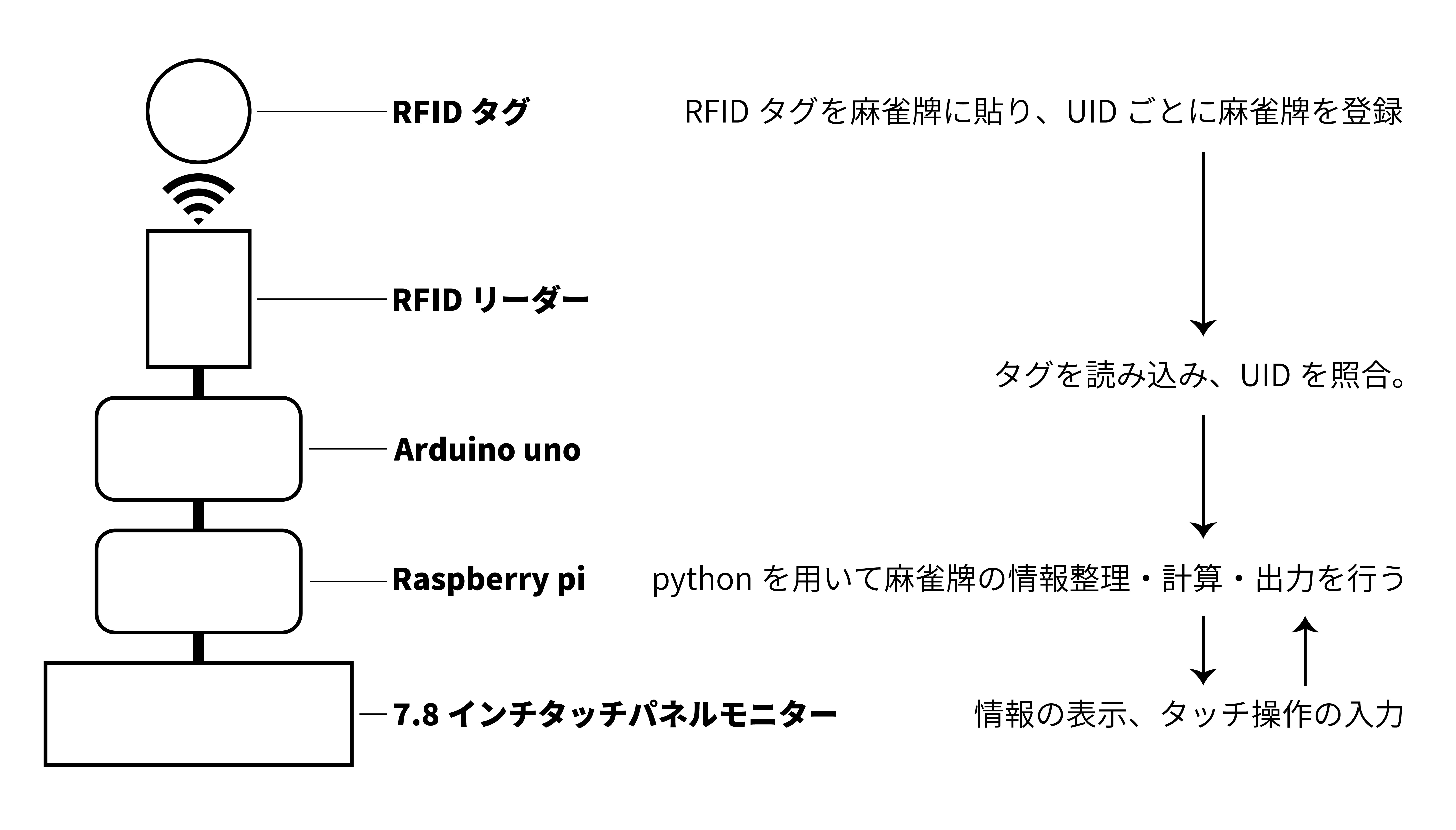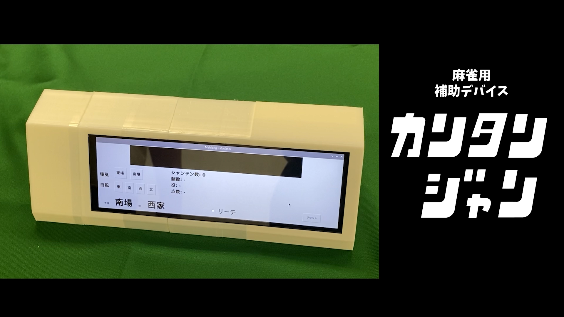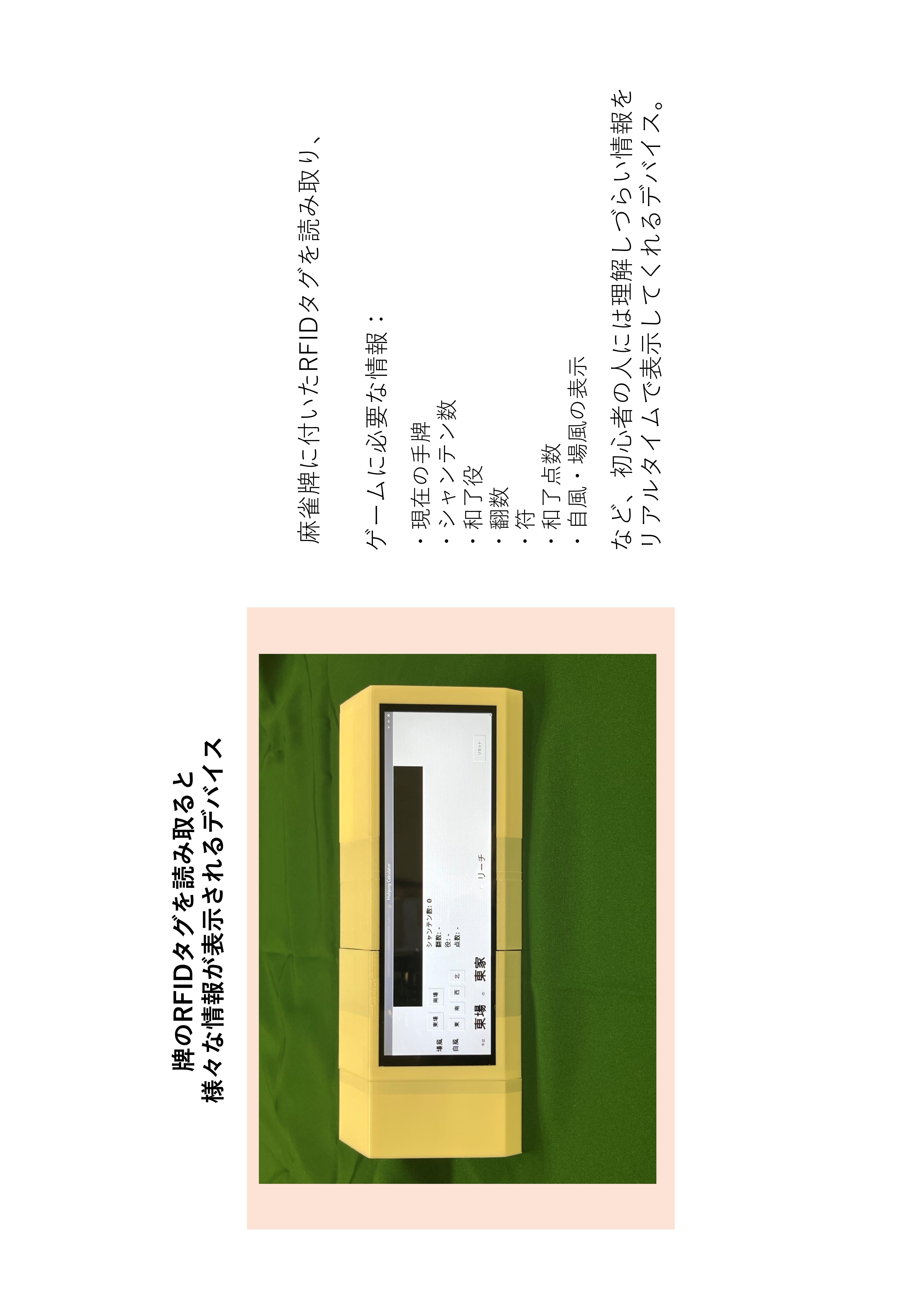 当デバイスは、RFIDの読み取りを利用することで麻雀牌をミスなくリアルタイム読み込み情報の表示を行うことが出来る。pythonを用いて計算をリアルタイムで行い、麻雀初級~中級者にとって補助となるような情報を出力、スクリーンに表示する。自風・場風の変更やリーチの有無などの可変情報は、画面タッチによるボタン操作で簡単に変更できる。