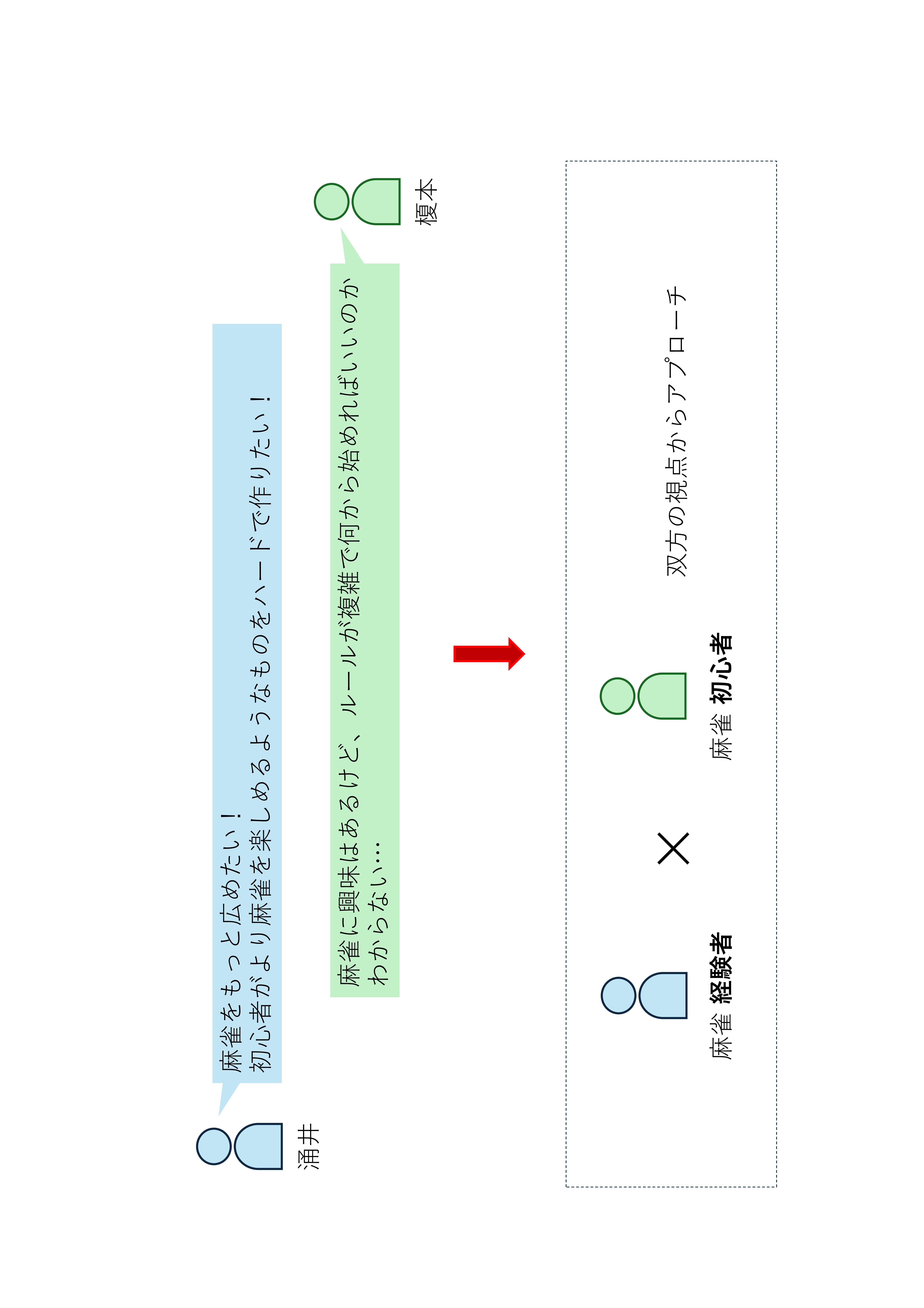 麻雀が大好きな涌井と、未経験者である榎本の麻雀に対する双方からの視点により、幅広い経験層をターゲットにしたデバイスを目指した。