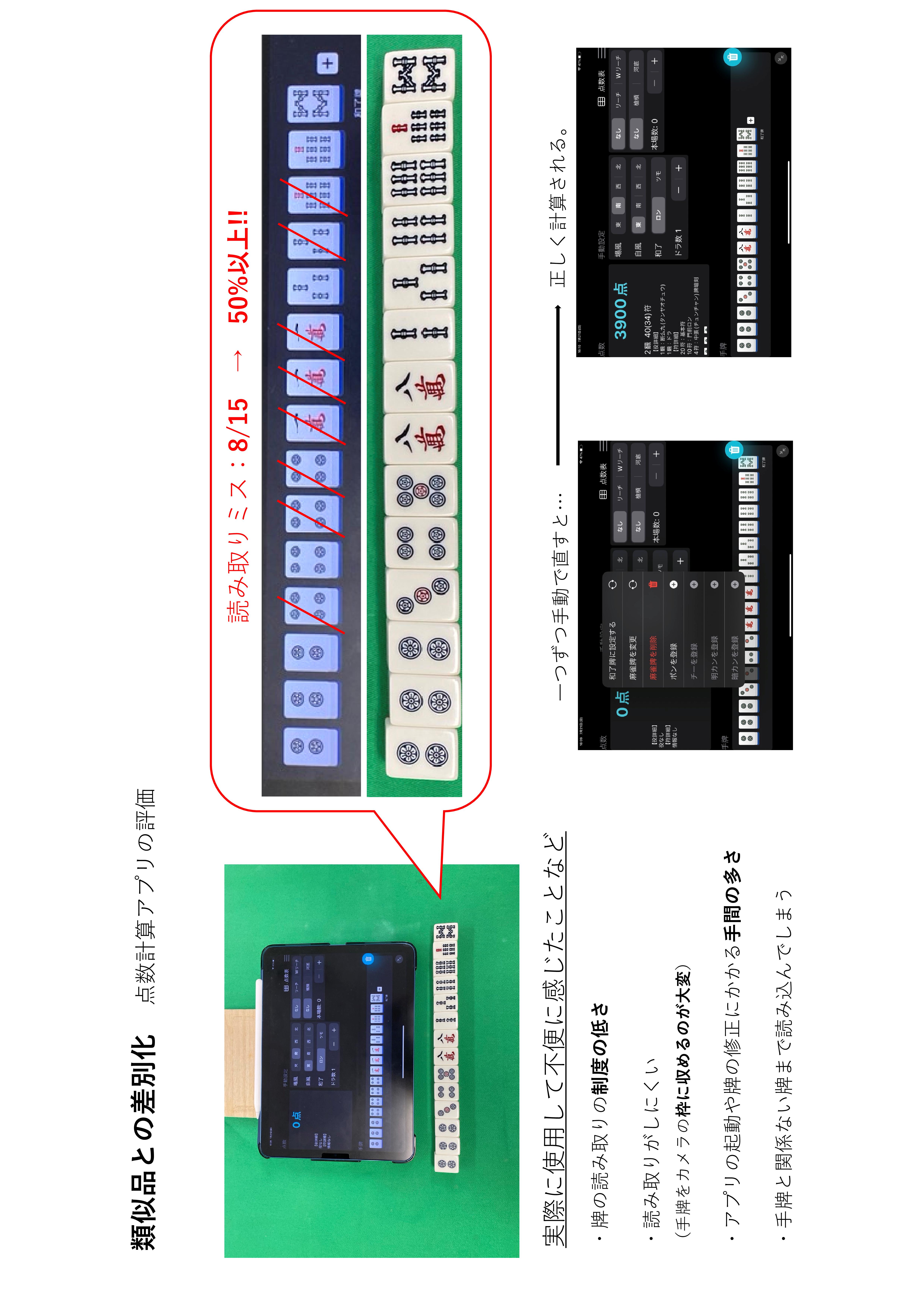 既に存在する麻雀の補助システムとして画像認識機能を利用し写真から解析・情報の表示を行うスマートフォンのアプリケーションなどがあるが、使用時に時間がかかることや読み取りの精度に使用感に不満が残るものばかりであった。
