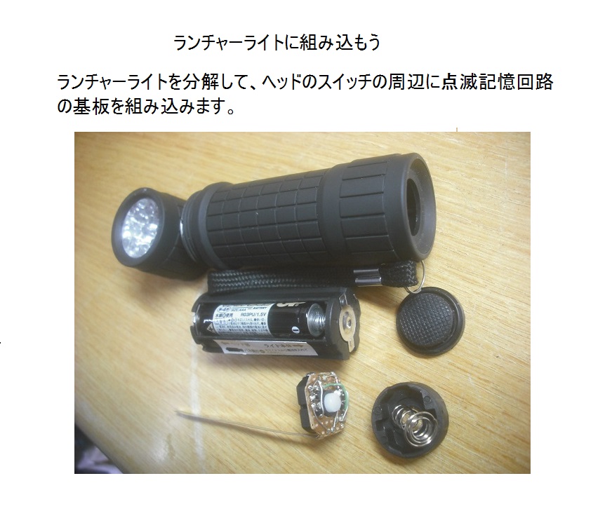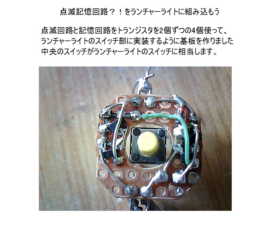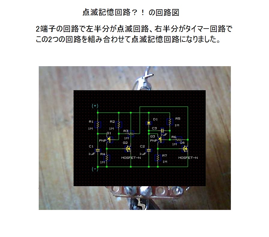 点滅記憶回路は、点滅回路とタイマー回路を組み合わせた2端子回路です。電源は不要で負荷から制御用に微小な電流をもらいます。直流回路で負荷のLEDに直列に接続し、短時間でスイッチのオン・オフ操作を行うことで、点滅状態を保持します。スイッチを長時間押すことで点滅の記憶は消えて、スイッチをオフにすると、LEDが消灯します。 いろいろな機器に簡単に点滅動作を組み込むことが出来る面白い回路です。