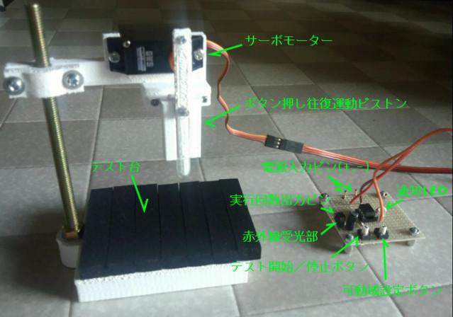 赤外線リモコン送信機の押しボタンの耐久性をテストするための機器です。手動で耐久性をテストするのが手間だったので自動化しました。テスト中にリモコンに異常が生じたとき、お知らせとしてLEDが点滅します。ボタン押し往復運動回数は18ビットのシリアル出力としているので、オシロスコープなどを接続して確認します。