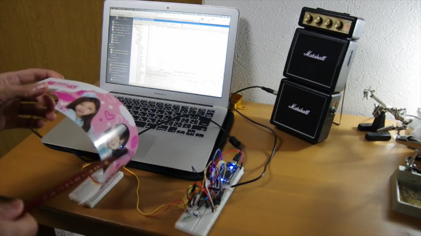 ミュージカルソウと呼ばれるノコギリ状の楽器を模した電子楽器を作製し、YAMAHAのボカロMdであるeVY1と組み合わせてみました。 のこぎりの部分には曲げセンサ、圧電素子が備わっており、これらのセンサ出力をマイコンボードであるmbedで受け、センサ出力に基づくMIDI信号をeVY1に送信しています。 曲げセンサからの出力がMIDIのピッチベンドコントロールに対応しており、音程を制御しています。