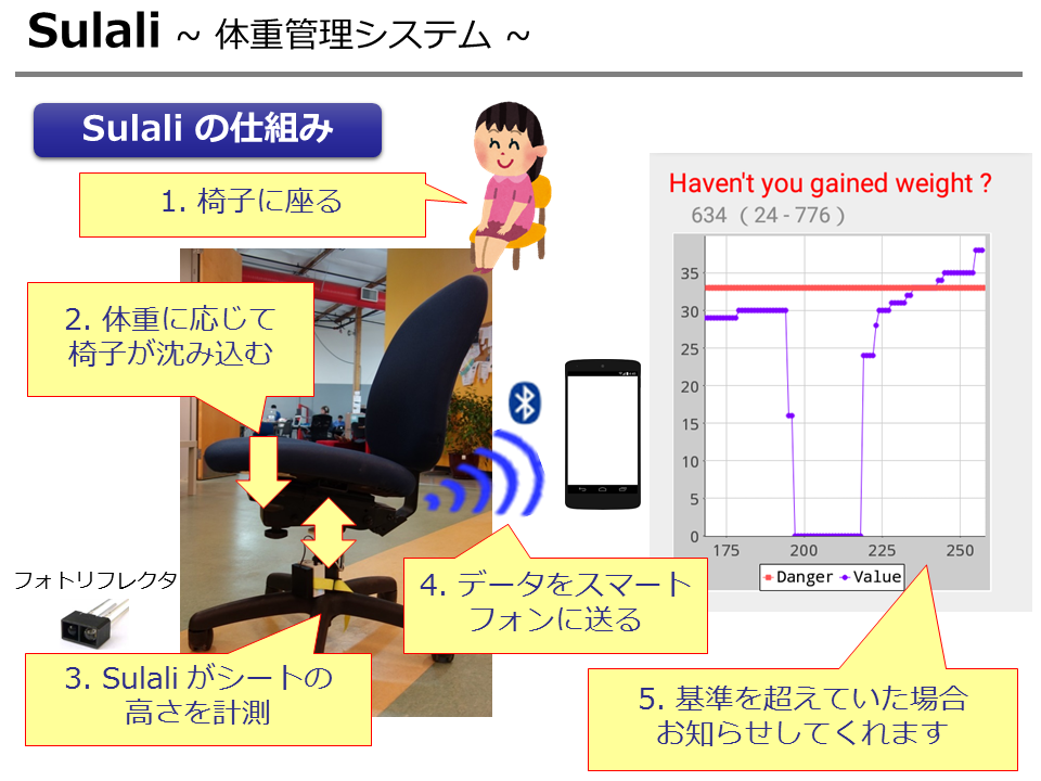 「体重が増えると戻すのが大変」「でも毎日体重計に乗るのは面倒くさい」。そんなあなたのお悩みをSulaliは解決します。Sulaliをあなたの椅子に付ければ、いつもの椅子に座るだけで、そっとあなたの体重を測り、体重が増加傾向にあればスマホに通知し教えてくれます。