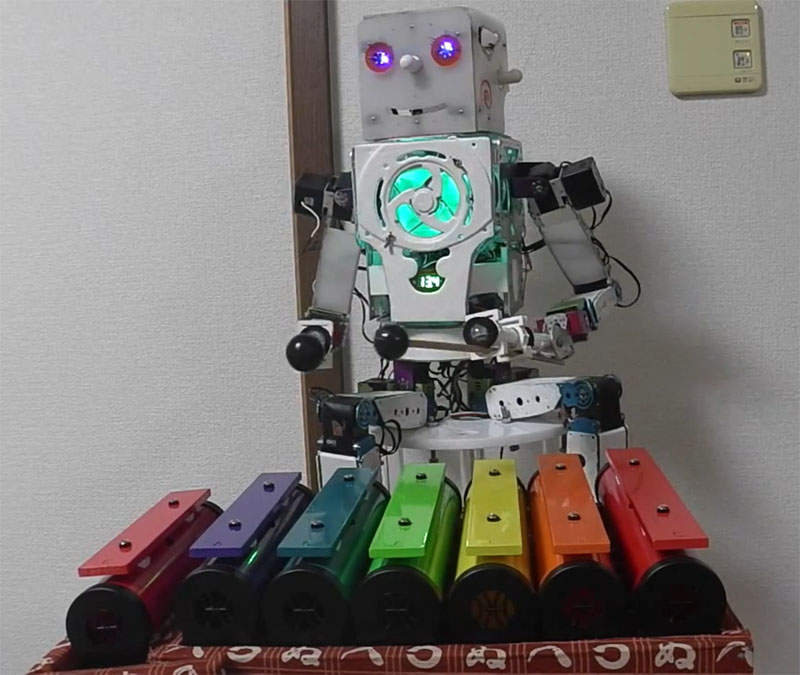 音楽を演奏するロボットです。 和太鼓、自作のアクリル製電子ドラム、鉄琴、アクリル製の亀の形をした打楽器などを演奏します。 頭と胸にファンがついていて、シャボン玉を作ることができます。 子供に大人気です。 12V電圧で動作する24軸ロボットです。
