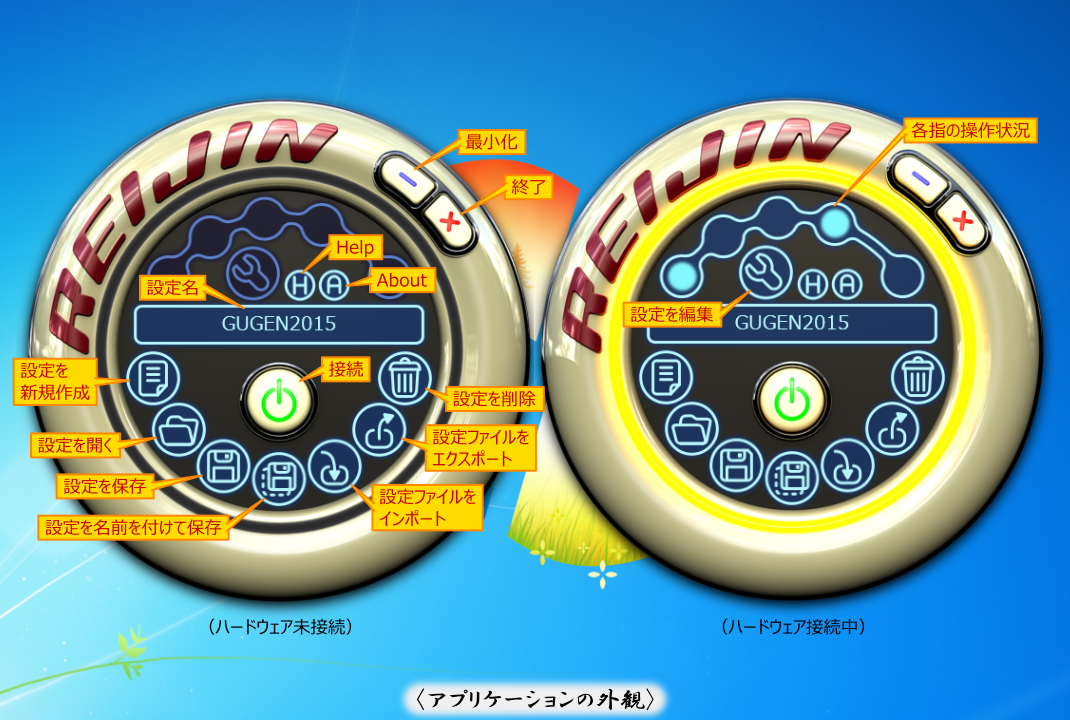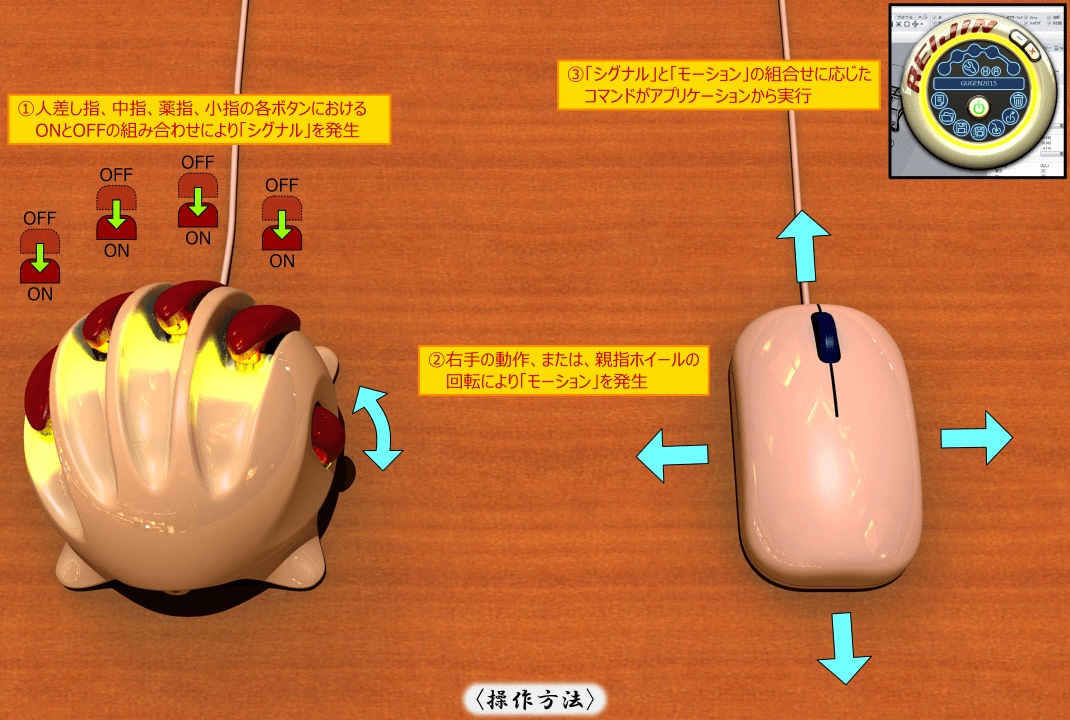 記憶とジェスチャをもとに早く効率的な操作を行うことを検討すると、脳科学における「手続き記憶(無意識で体が反応する記憶)」を活用できる、と考えました。例えば、楽器の練習をしていると楽譜を見ただけで自然と手が動くようになる、というのが手続き記憶のよい例です。本作品のセールスポイントは、このような手続き記憶を十分に活用できるデザインと操作方法を備えていることです。手を添えただけで自然とボタンに指が合う、つまり、目で見てボタンを確認する必要のないデザインになっています。操作は、左手の人差し指?小指を押す組合せで「シグナル(15通り)」を発生させ、右手または左手親指の動作である「モーション(6通り)」との組合せで処理を実行するというものです。合計90通りの操作があり、それぞれにコンピュータへ入力する「コマンド」を設定できます。本作品を使い続ければ、設定した操作を楽器を演奏する感覚で自然とからだで覚えます。このようなことから、伶人(古語で音楽の演奏を職とする人)に当てはめ、REIJIN(レイジン)という名称にしました。