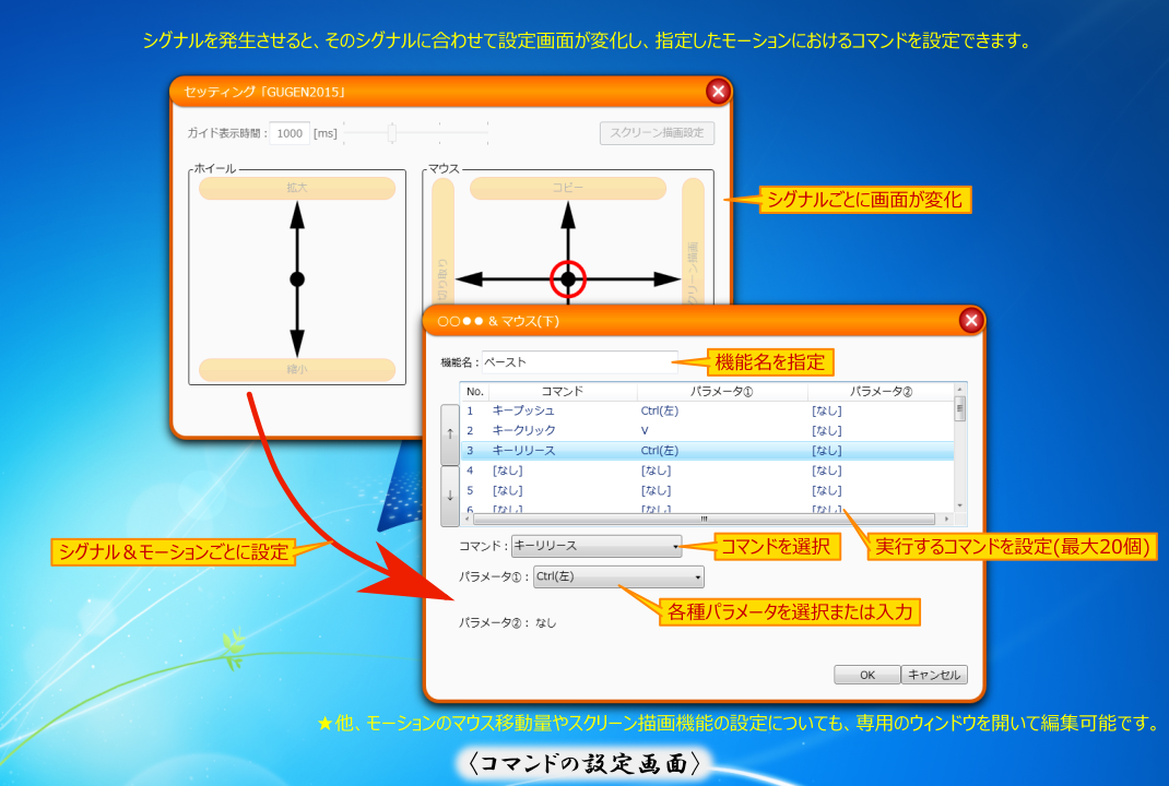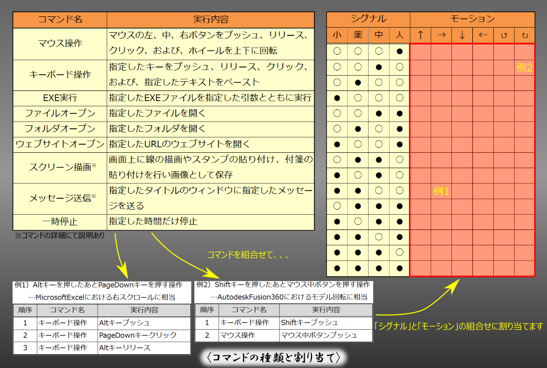 90通りの操作に対して、以下に示す9種類のコマンドを設定(複数設定可能)することができます。