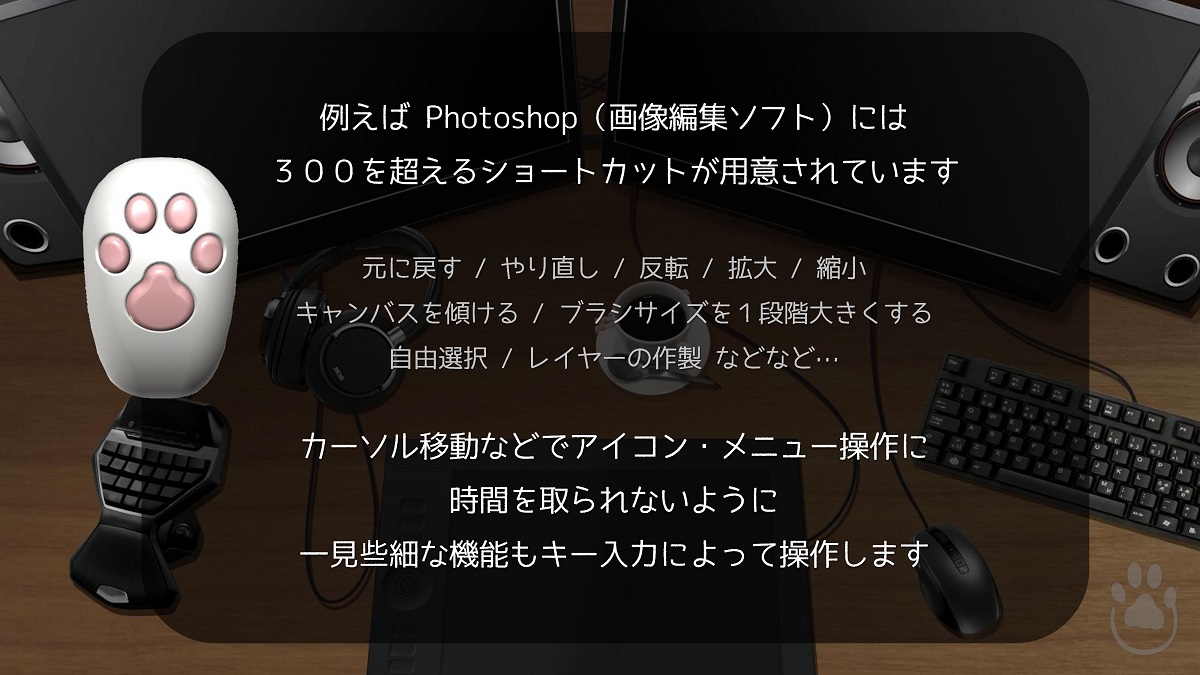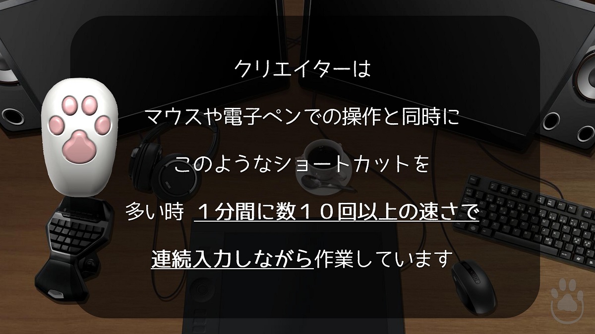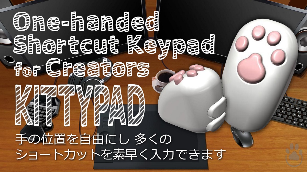 KITTYPADはデジタルクリエイター、e-Sports競技者のための、片手把持型ショートカット入力補助デバイスです。手の位置を自由にし、より多くのショートカットを、素早く・簡単に実行できます。例えばPhotoshopには有効なショートカットが300以上用意されています。クリエイターはそれらの内、特に頻繁に利用するショートカットを選び、設定し、毎分数十回?100回以上の連続した入力作業をこなしています。しかしこの作業は、いわゆる一般的なキーボードの類では大変窮屈な作業になります。1、手の位置を固定する必要がある。2、指が届く範囲での限られたキー入力になるため、有効なショートカットをカバーしきれず、限定した設定になりがちである。3、デスクスペースをキーボードで占有してしまう。など、課題があります。