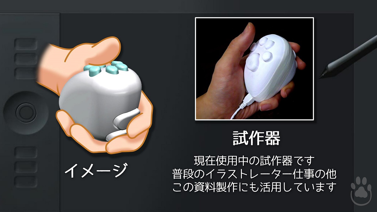 元々、肉球をモチーフにしたデザインを目指して開発していたわけではありません。親指に複数のキーを操作させる場合、従来のゲームパッドのように、同じサイズのキーが等間隔で並んでいるものがほとんどです。しかし、親指のサイズ・骨格、神経感覚などを考慮し、「最小の運動で、速く、連続した入力を可能にする」という条件に対応したとき、このデザインが生まれました。