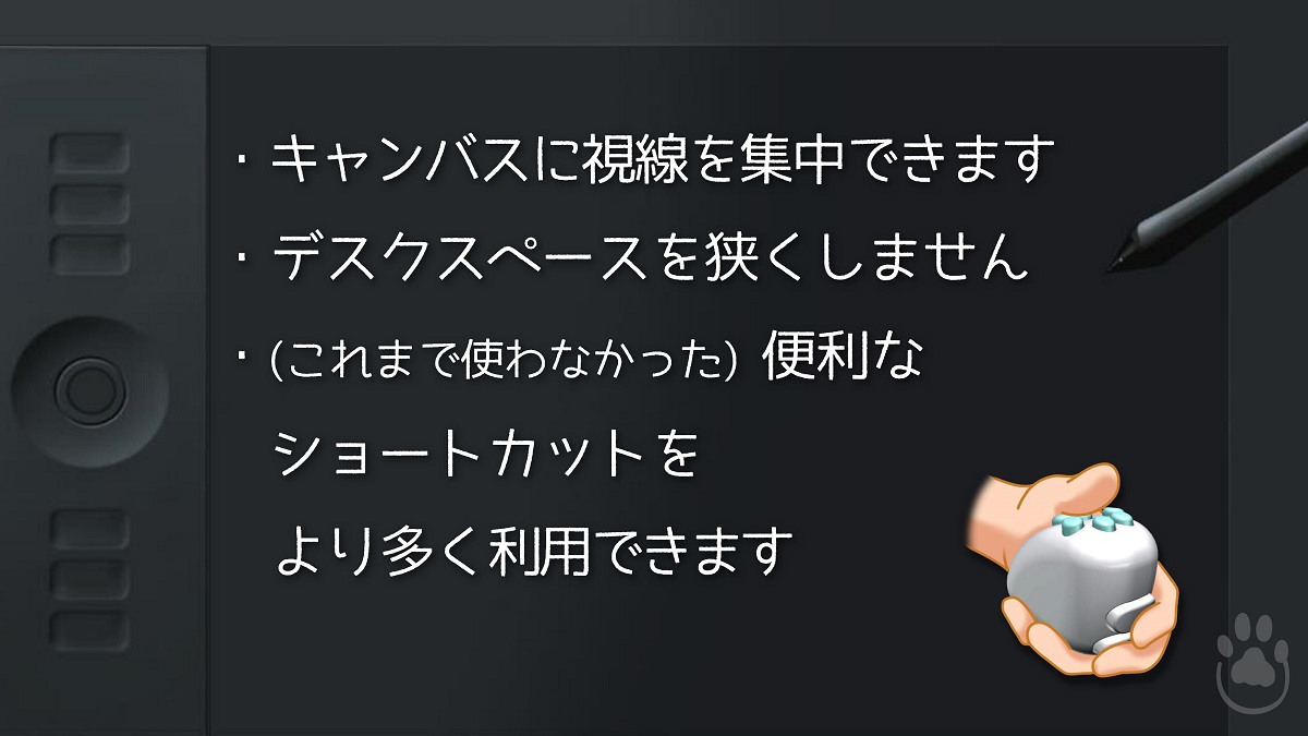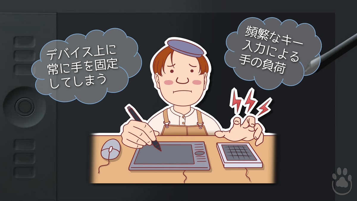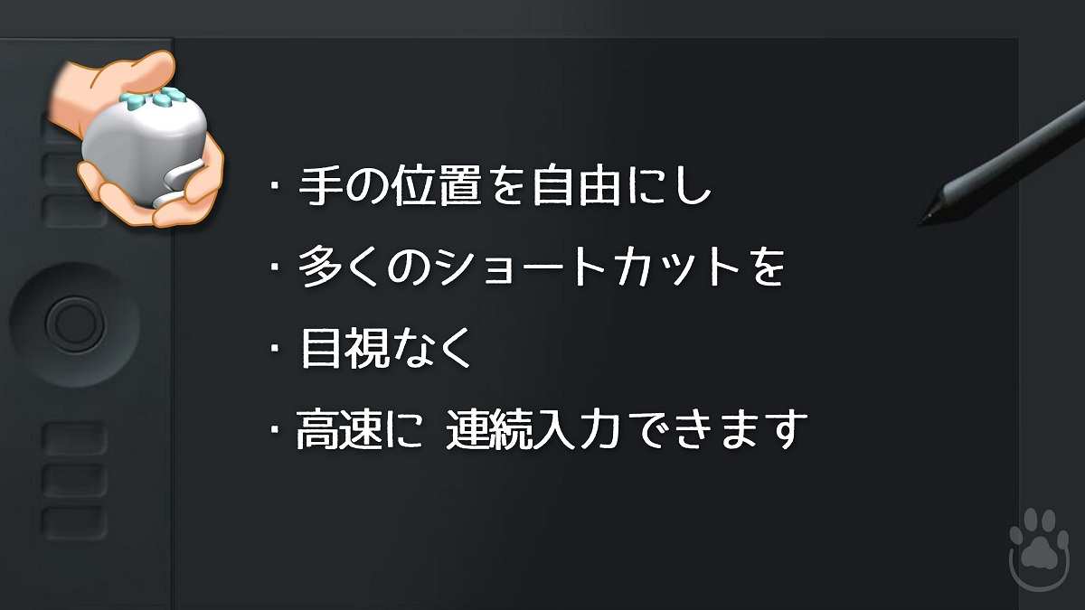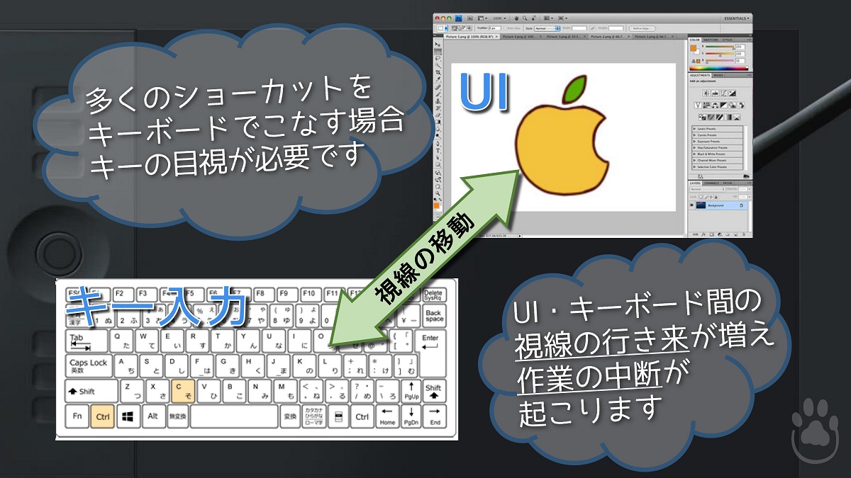 ・指の運動(型)でどの機能(ショートカット)を実行するかを身につけられるため、キーボードのようにキーの目視が必要なく、UIとキーボード間の視線の移動も無くなり、キャンバスやプレイ画面だけに視線を集中できます。