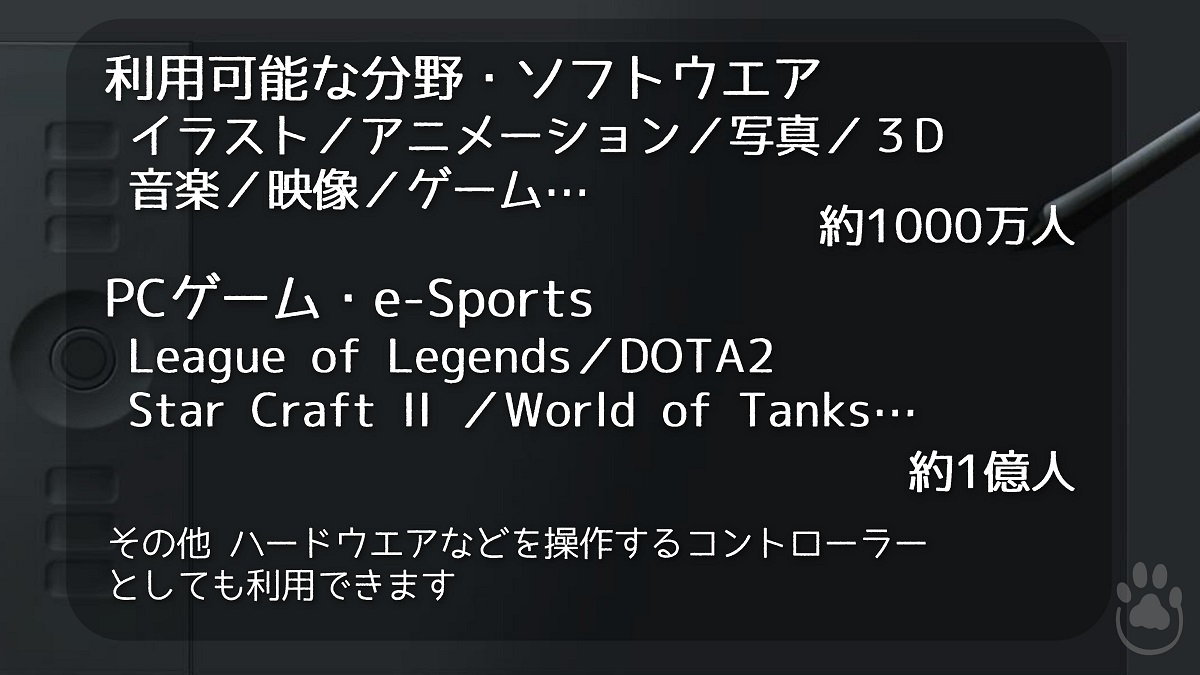 このデバイスはイラストレーター・フォトエディター他、映像、アニメ、音楽、3Dのコンテンツ制作のソフトウエアで有効です。また、近年盛り上がりを見せるe-Sportsの分野でも活用できます。