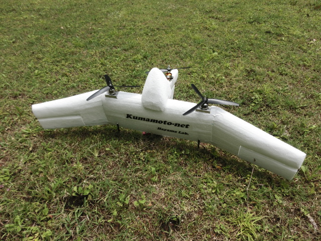 ありそうでなかったVTOLです。トライコプターで垂直離着陸、機体を傾けて連続的に安定に飛行機モードになってビュンビュン飛びます。