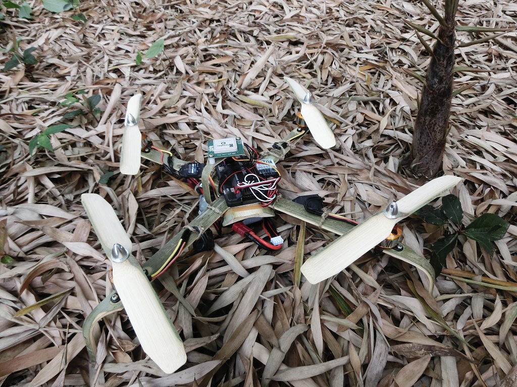 プロペラを竹から削り、フレームも竹で作りました。雰囲気を出すために、結束バンドじゃなくて麻紐で縛ってみました。