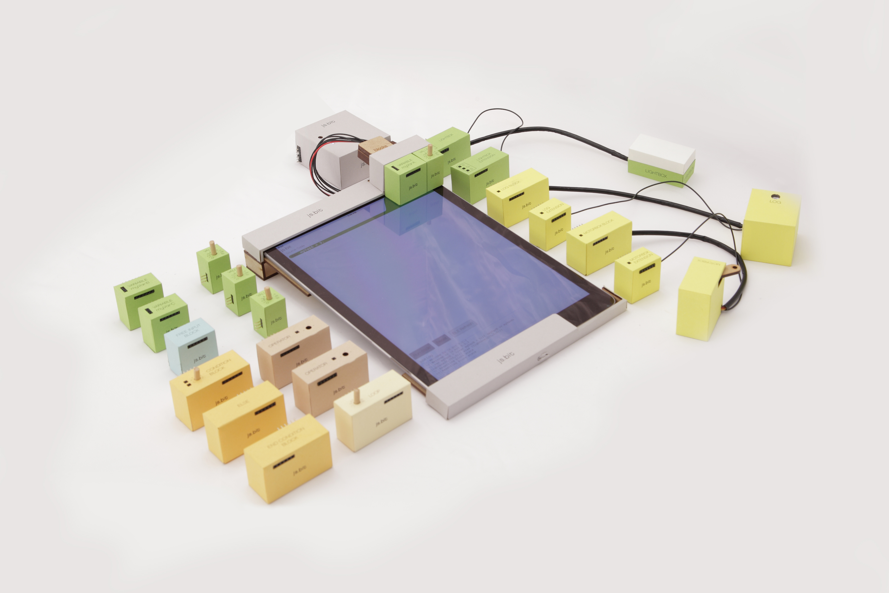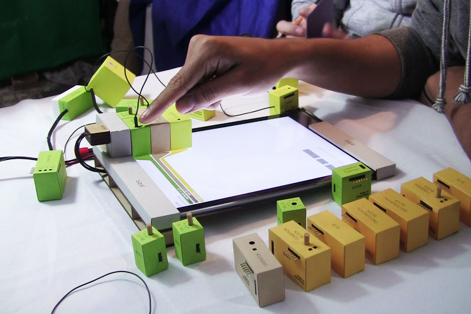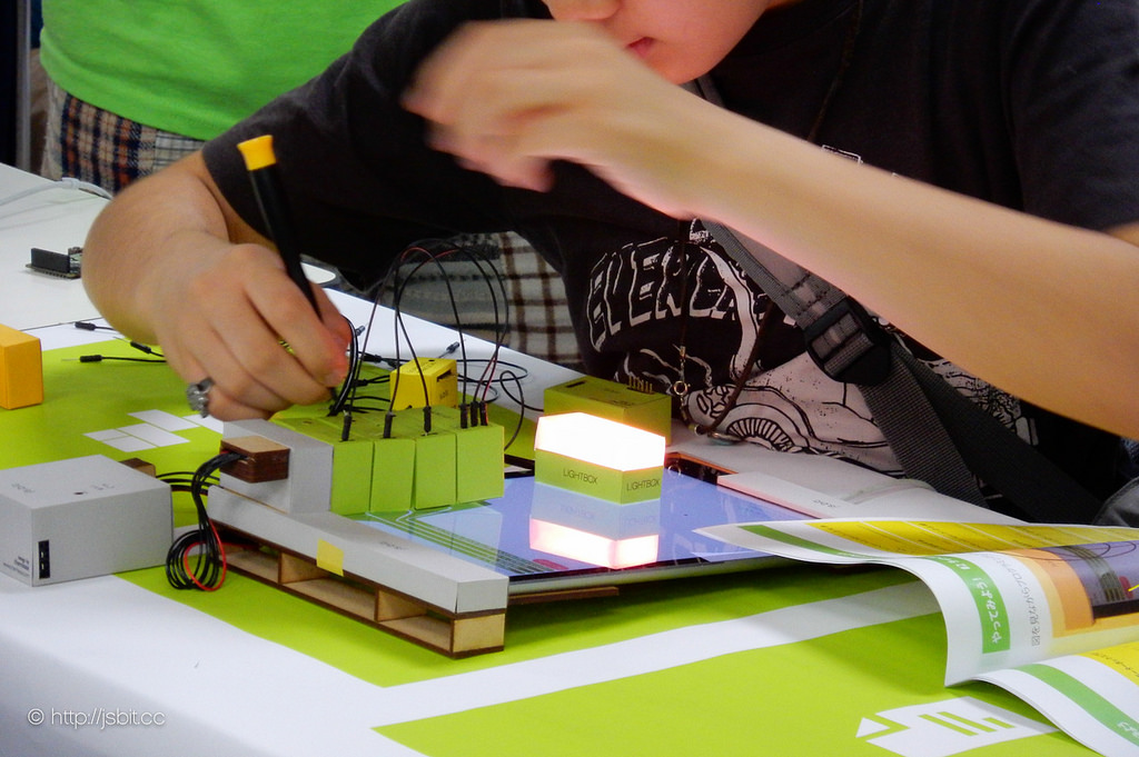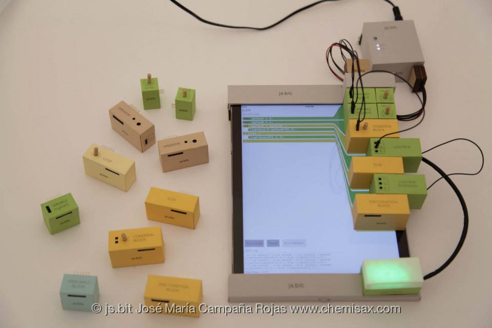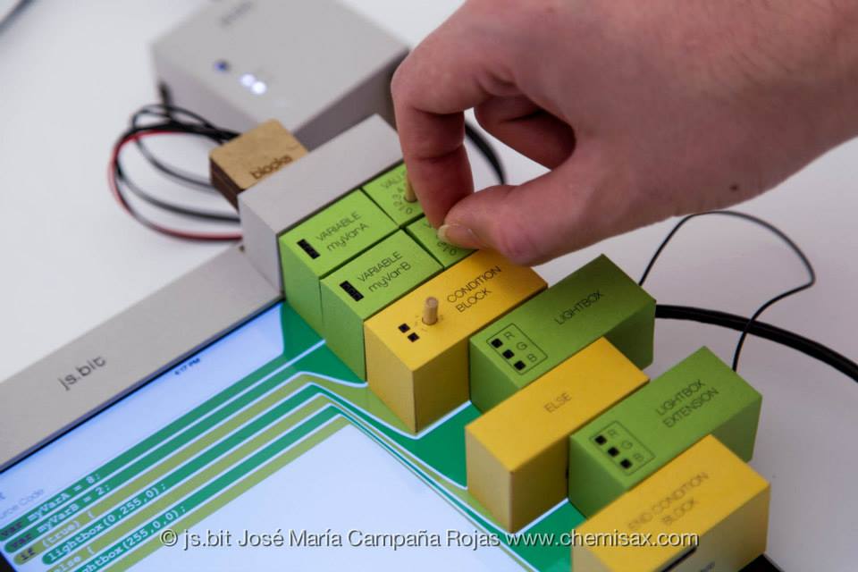 js.bitはブロックを繋げてプログラミングするツールです。iPadとjavascriptの構文の役割を持った28個のブロックから成り、ブロックをつなげていくとiPadの画面に実際のプログラミングコードが表示されていきます。ライトの色や光量、モータの動く角度などを制御することができ、手を動かしながら感覚的にプログラミングを学ぶことができます。