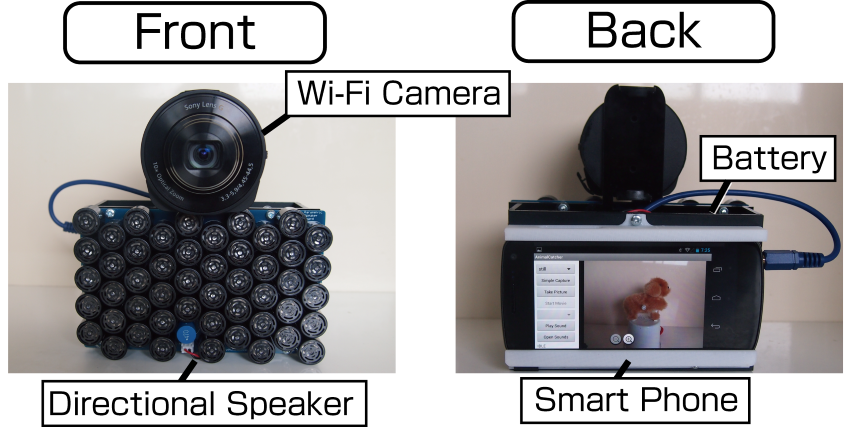 動物の写真を撮影することは中々難しいものがあります.動物にカメラを向けても人間のように目線をくれませんし,言葉で指示しても応えてくれません.そのため,よい写真を撮るために人間は音を出したりジェスチャをしたりと,あの手この手で動物の気を引く必要があります.こうした苦労を軽減するために,本研究では,撮影中に動物の注意を引く多様な音を指向性スピーカーで照射することによって,意図的に動物のリアクションを引き出すカメラ「AnimalCatcher」を提案します.