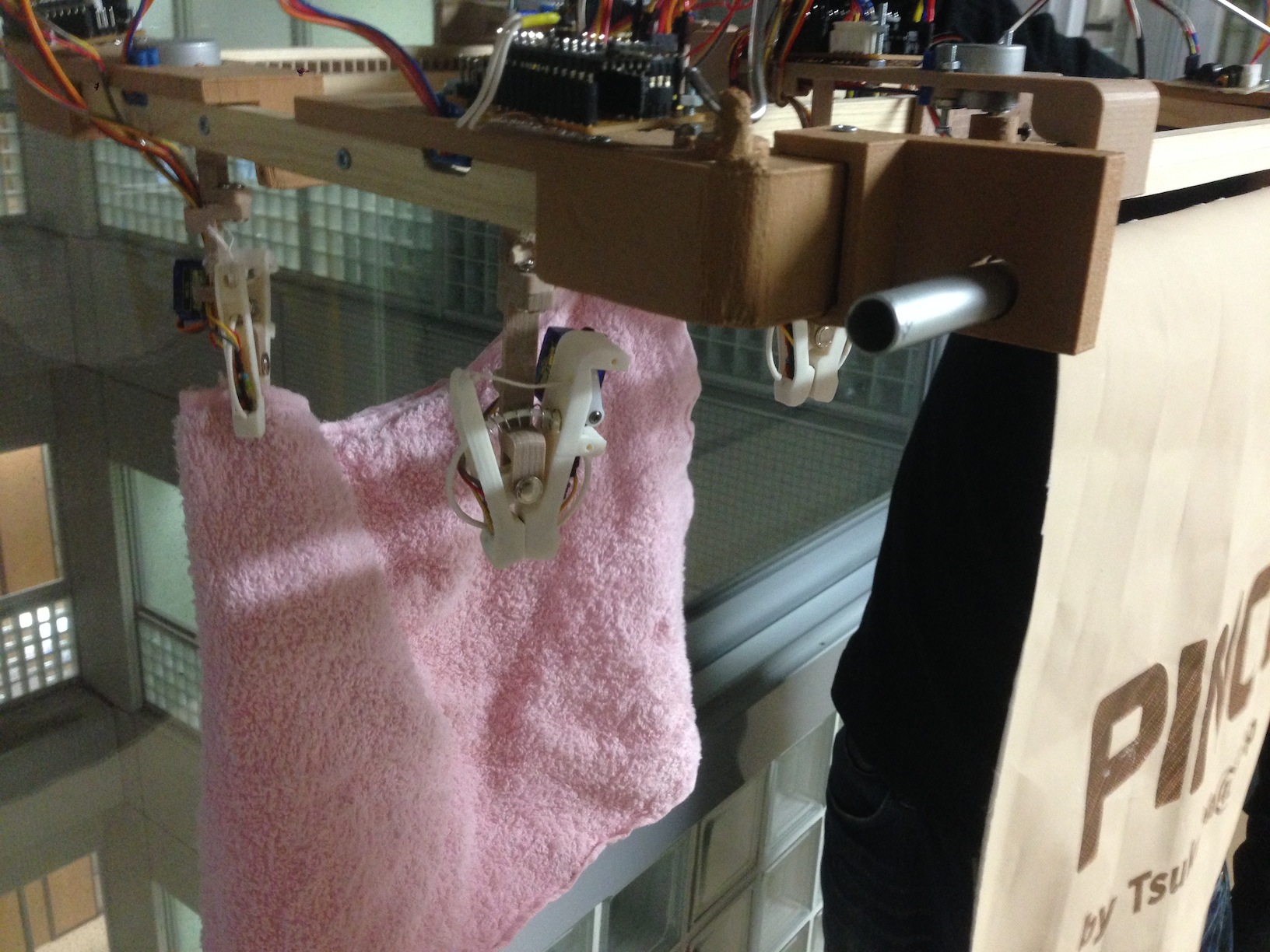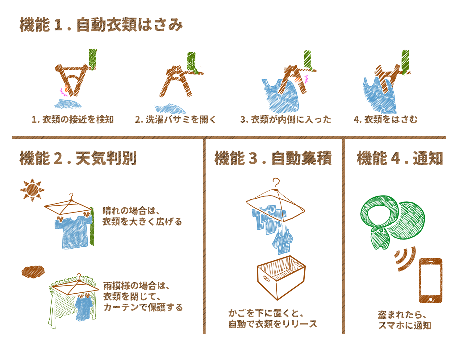 ハサミ部分の自動開閉や,天気に反応して衣類の向きや開き具合を制御する機能を搭載し,スムーズで賢い洗濯干しを体感できるデバイスです.