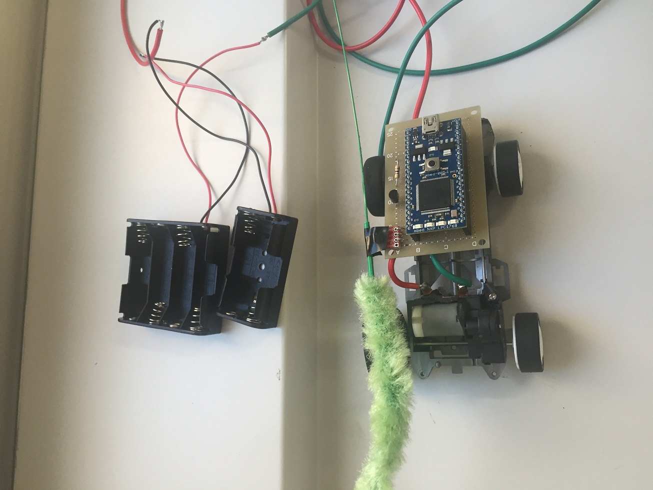猫じゃらしに触れると、ミニ四駆が自動で動くというデバイスです。猫が永遠と猫じゃらしを追いかけていれば面白いと思い、作りました。このデバイスさえあれば、家に人がいない場合でも、猫だけで遊ぶことができます。さらに、このデバイスにより、猫の運動不足を解消できると期待しています。将来的には、無線で動かして、よりコンパクトにしていきたいと考えております。なお、今回はモータの制御にmbedを使用しています。