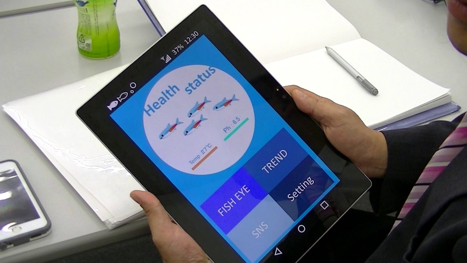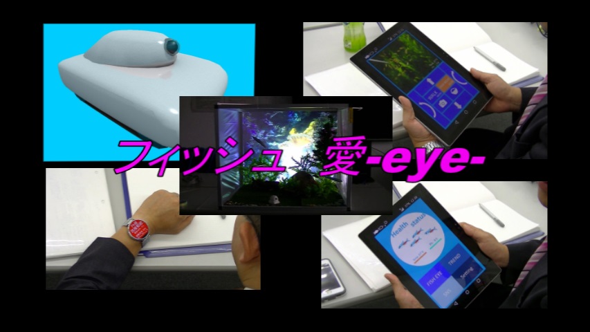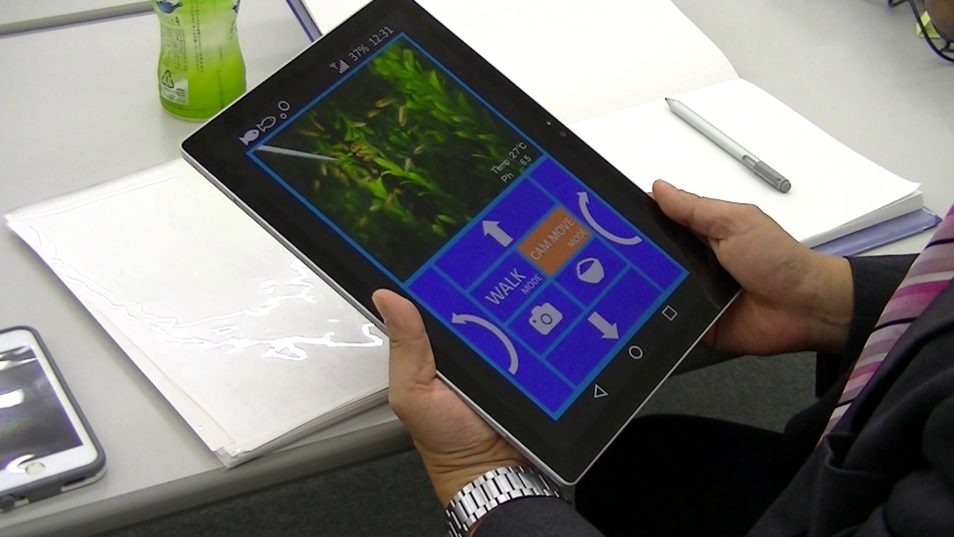 製品名は「フィッシュ 愛-eye-」。「フィッシュ 愛-eye-」は水槽の中を自由に移動でき、搭載されたカメラで水槽の中からの様子(魚の目線)を撮ることができます。また、この「フィッシュ 愛-eye-」はアプリと連携しています。アプリでは「フィッシュ 愛-eye-」を自在に操作でき、水槽の中の魚を、あらゆる場所や角度から見ることができます。