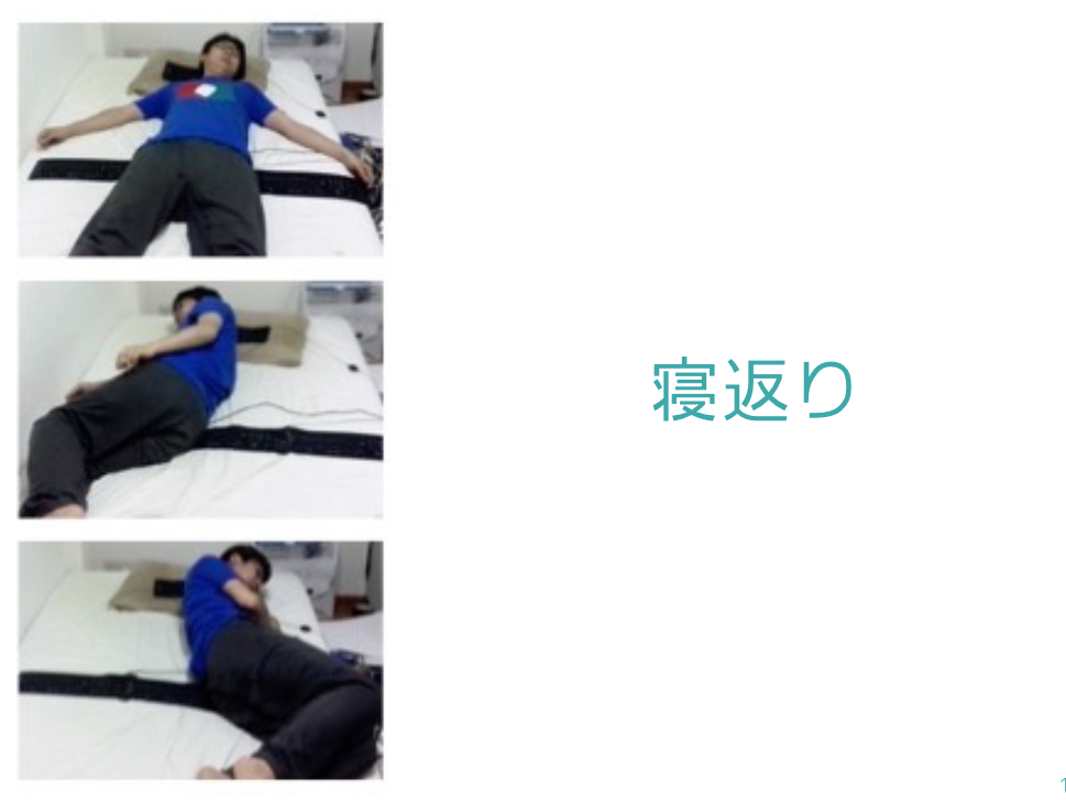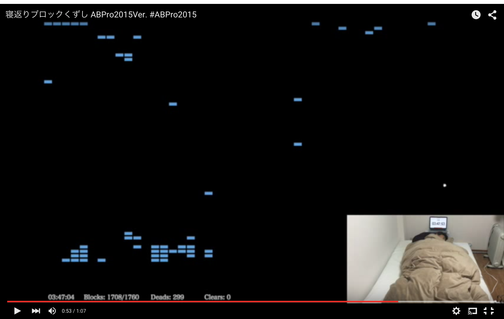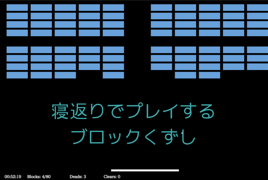 キーボードのキーの位置に応じてブロック崩しのバーが移動します。寝返りをうって体の位置が変わると、押下するキーが変わるのでバーの位置も変わります。