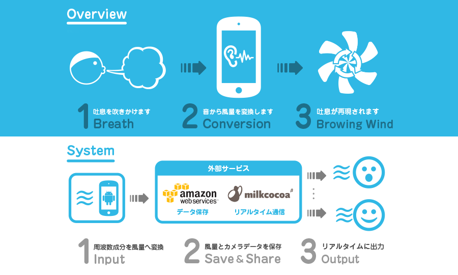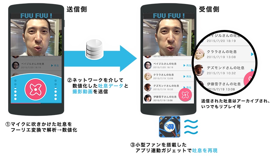 これらを実現するために専用システム(アプリとガジェット)を開発しました。スマートフォンのマイクに吹きかけた吐息を、インターネットを介し遠隔地にいる不特定多数のユーザーにリアルタイムでブロードキャストすることができます。さらに、送信された吐息はデータベースにアーカイブされ、過去の吐息を参照することが可能です。