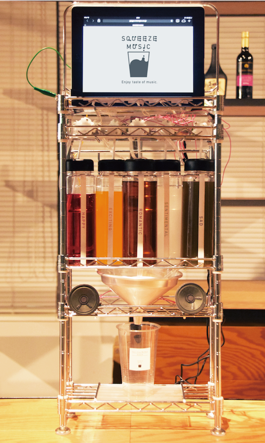 Squeeze Musicは、音楽を再生しながら、その楽曲のムードに合ったミックスジュースを自動作成するジュークボックス型プロダクト。
