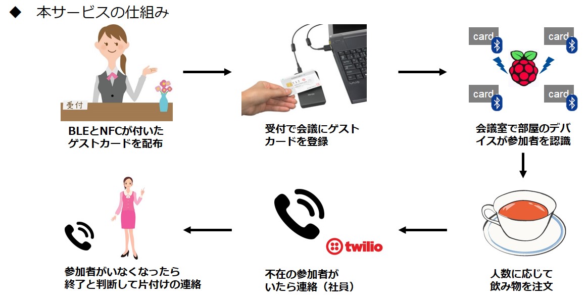 本作品はオフィス等での来客時に、社員や職員が飲み物の注文や片付けの連絡、他の参加者への声かけなどを、状況に応じて自動的にアクションを行ってくれるサービスです。
