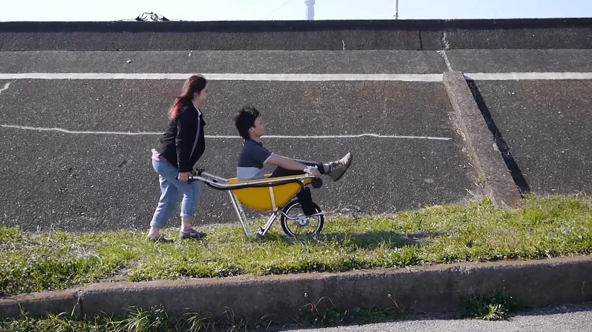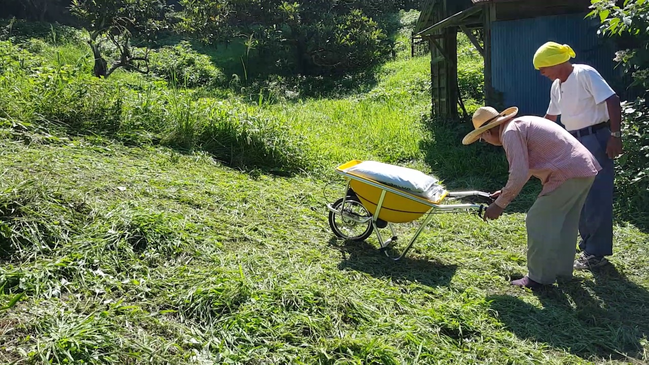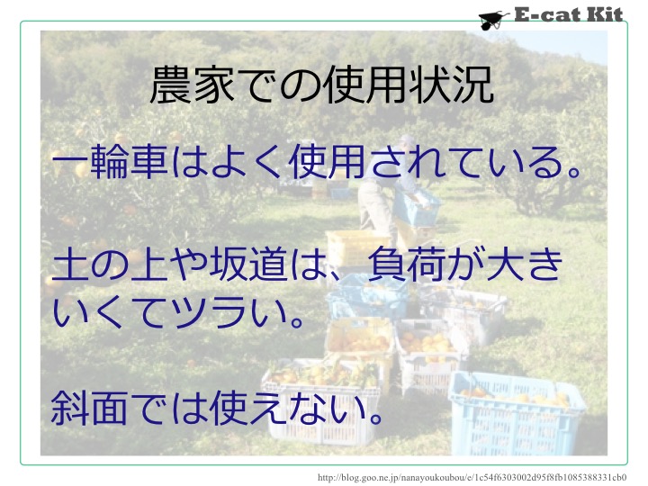人力に頼っている小規模の農地内輸送/建築輸送を一輪車の電動化で解決する「キット」です。