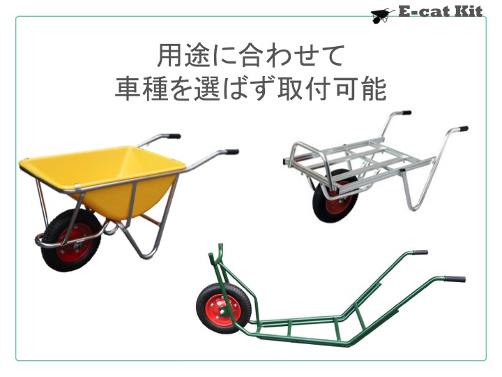すでに普及している一輪車に取り付けるため違和感なく導入でき、軽量で取り回しが良いため狭所や傾斜地でも気軽に使うことができます。