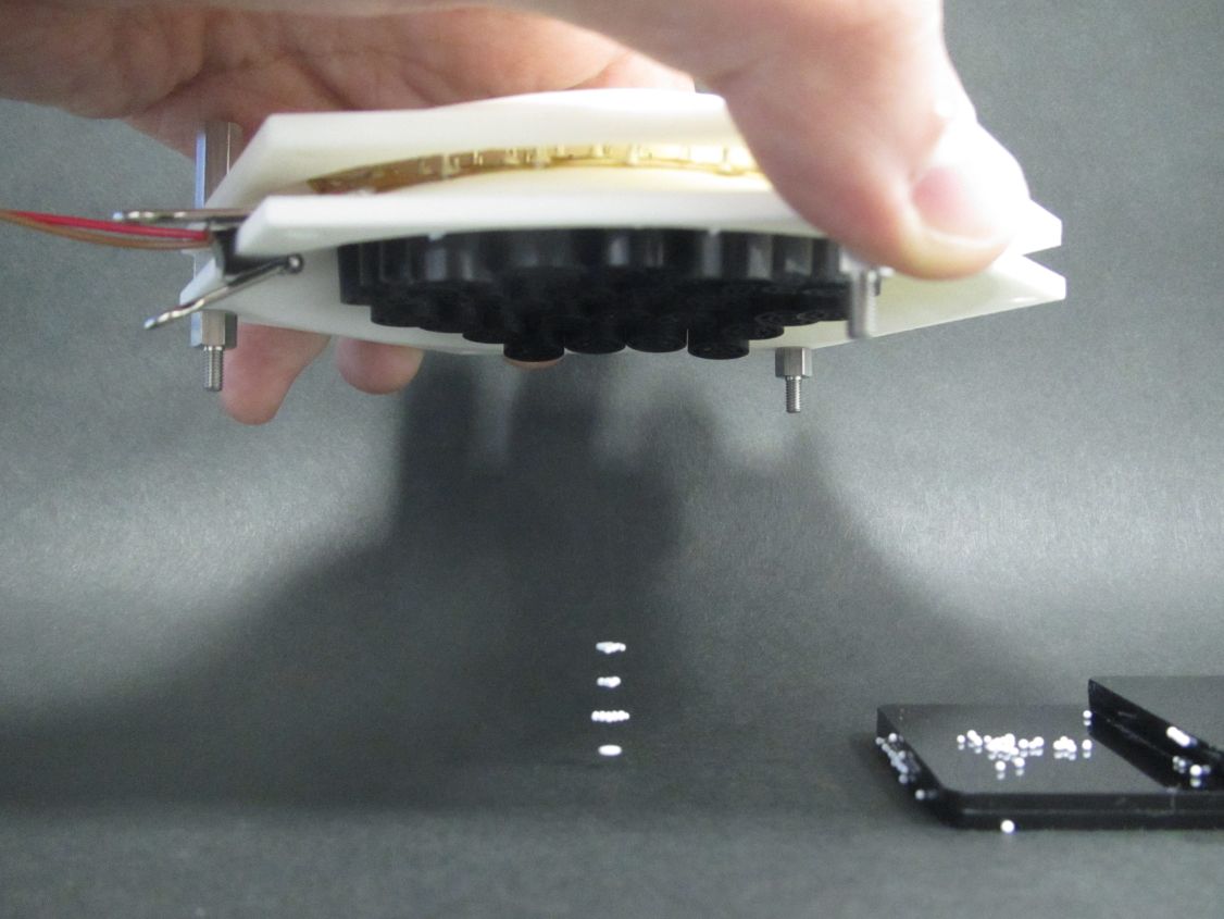 持ち手を動かすと粒もついてきます。また定在波の節に合わせた段差を利用して、異なる高さに粒を浮かせたりできます。これは音を可視化するインタラクティブな教材としての利用も見込まれます。