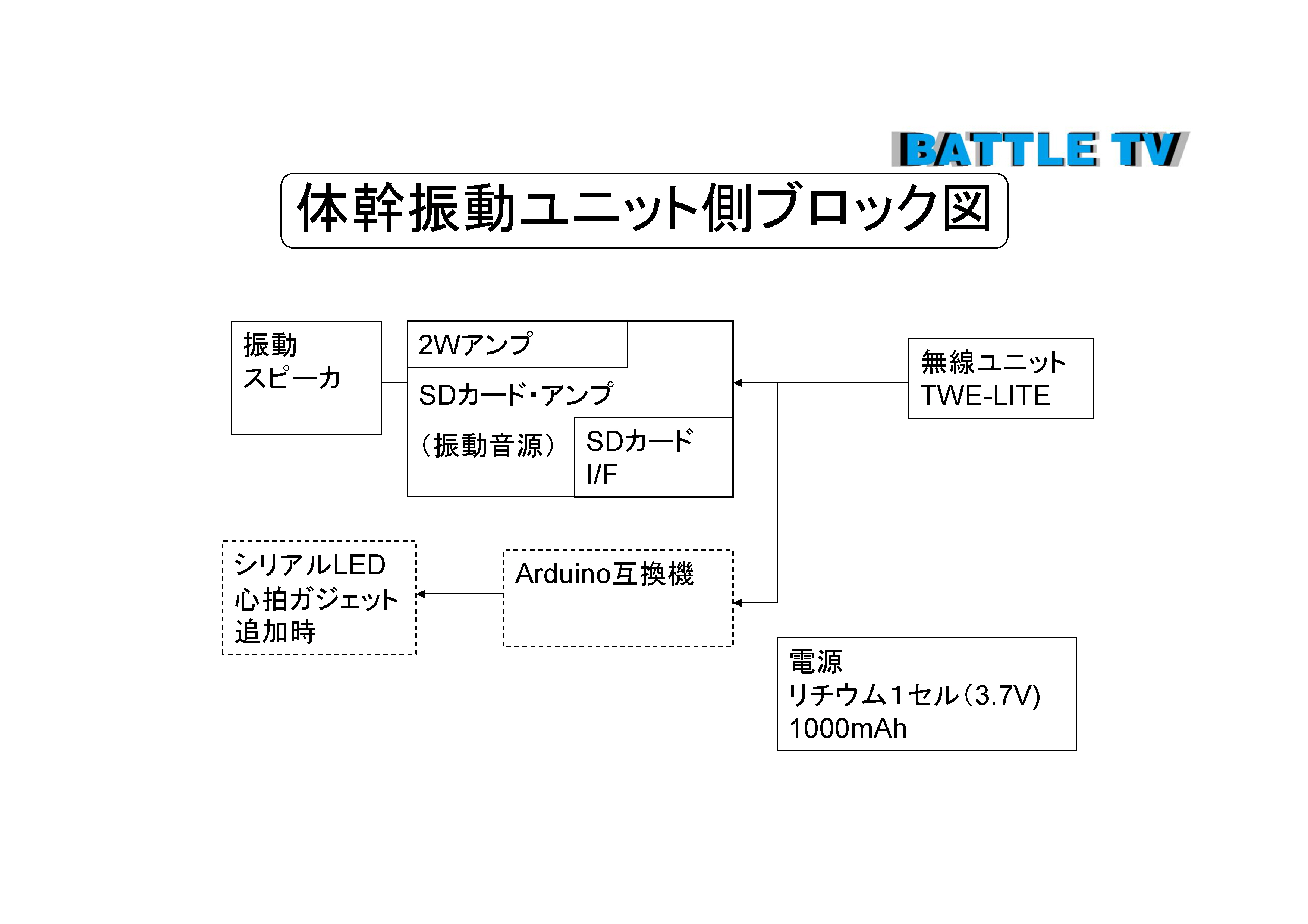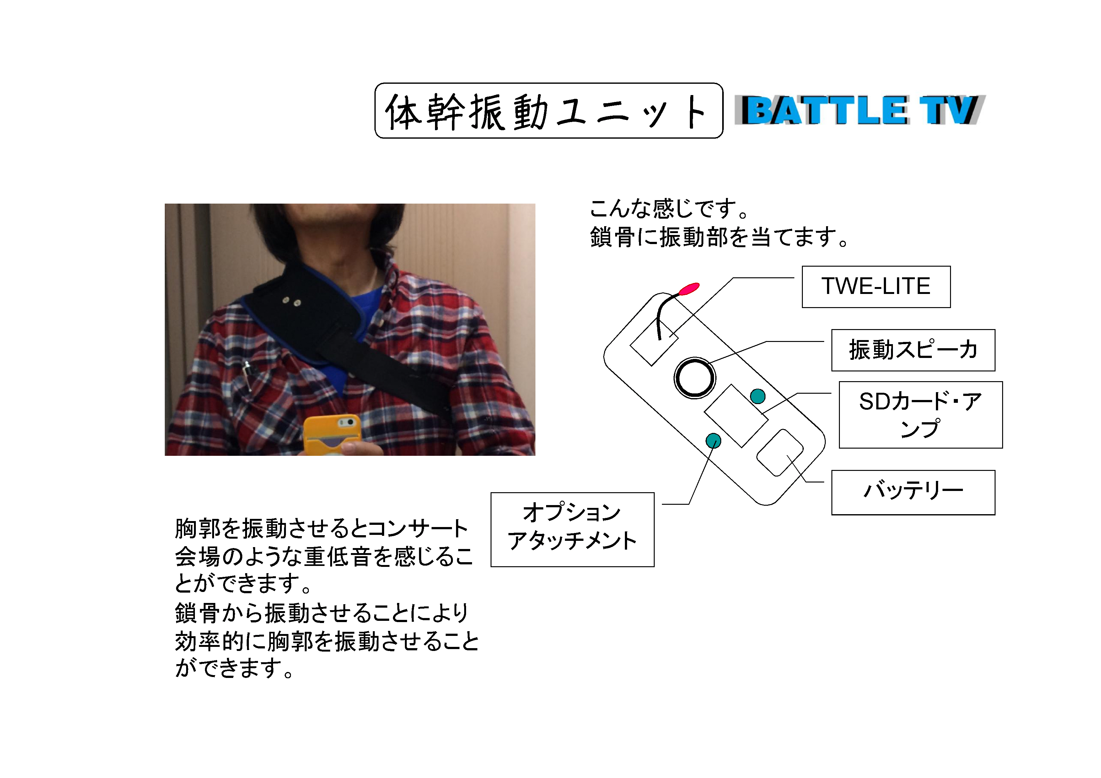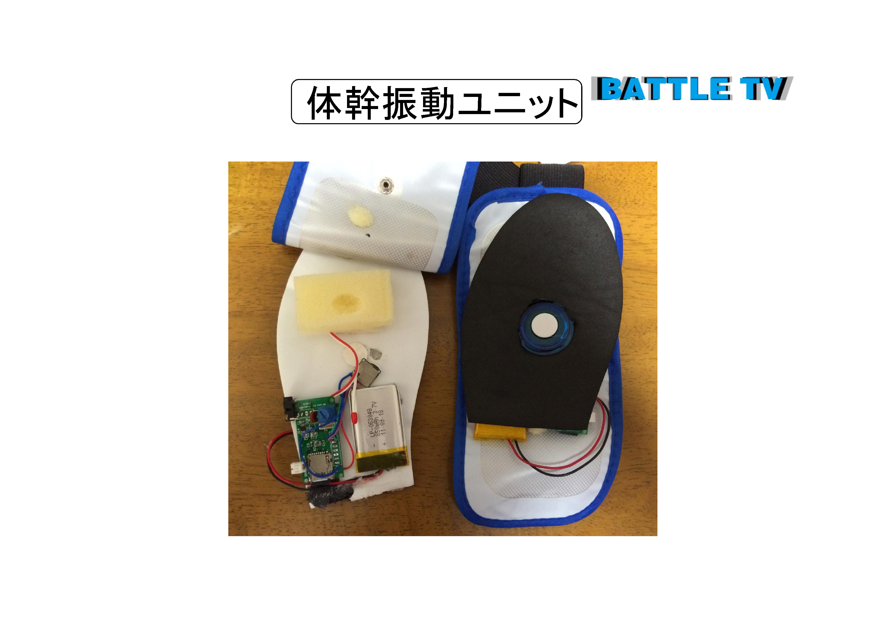戦闘アニメの低音部を増幅して爆発音を振動に変えて直接骨に伝えます。