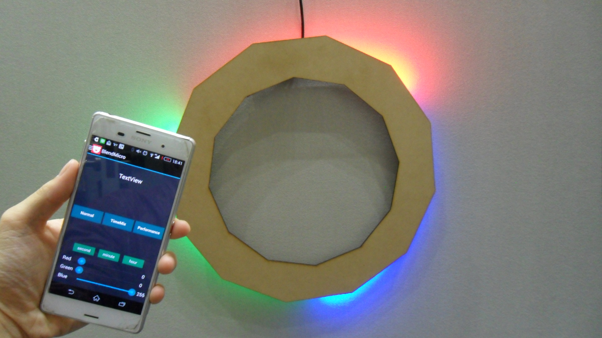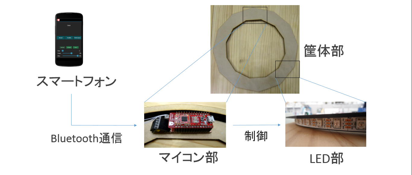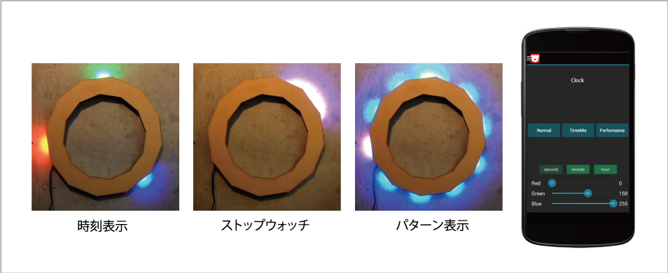 また,そのLEDテープを制御するマイコンにはBluetoothモジュールが搭載されており,専用のスマートフォンアプリを用いて,ユーザーは時間表現の柔軟な制御を行うことができます.