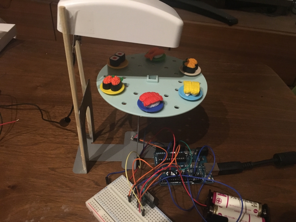 「年収800万超えたあたりから寿司が止まって見えるらしい」というネット上の有名なネタ(2chのコピペ)を実現するため、ゾートロープの仕組みを使って回転周期と照明の点灯の周期を合わせることによって、寿司が止まって見える装置をつくりました。